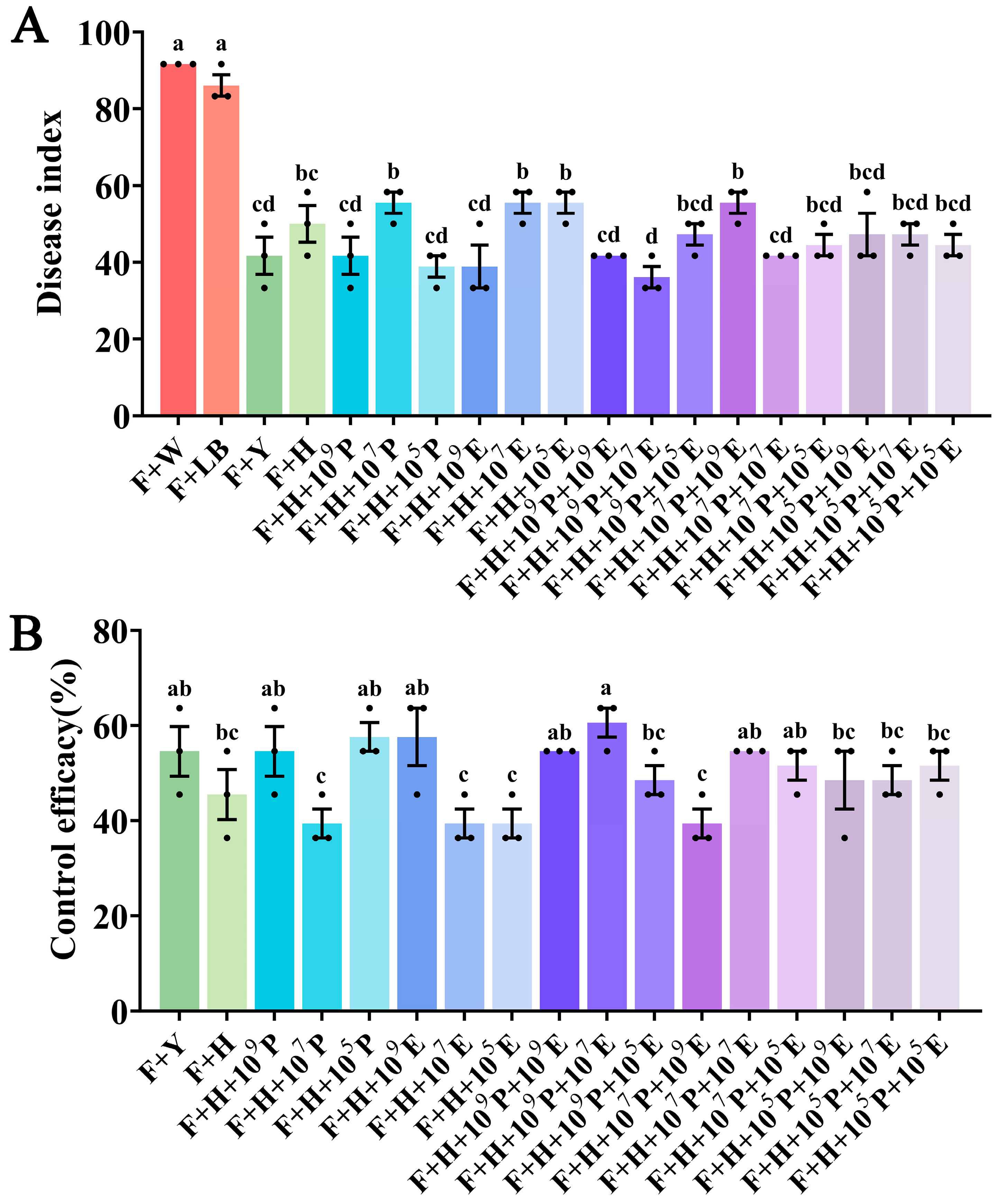 Figure 5. Biocontrol effects of the combined application of bacterial strains against cowpea Fusarium wilt. (A) Disease severity index; (B) Biocontrol efficacy. Each treatment was performed in triplicate, and data are expressed as mean ± standard error (SE). Different letters indicate statistically significant differences among treatments at p < 0.05 based on ANOVA. Each treatment was repeated three times, and each replicate contained three cowpea seedlings.