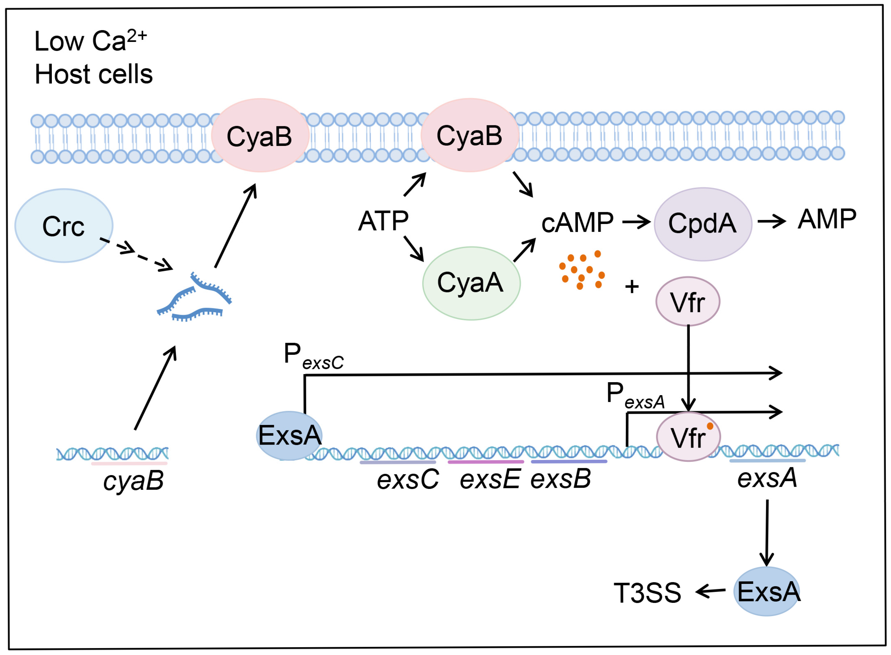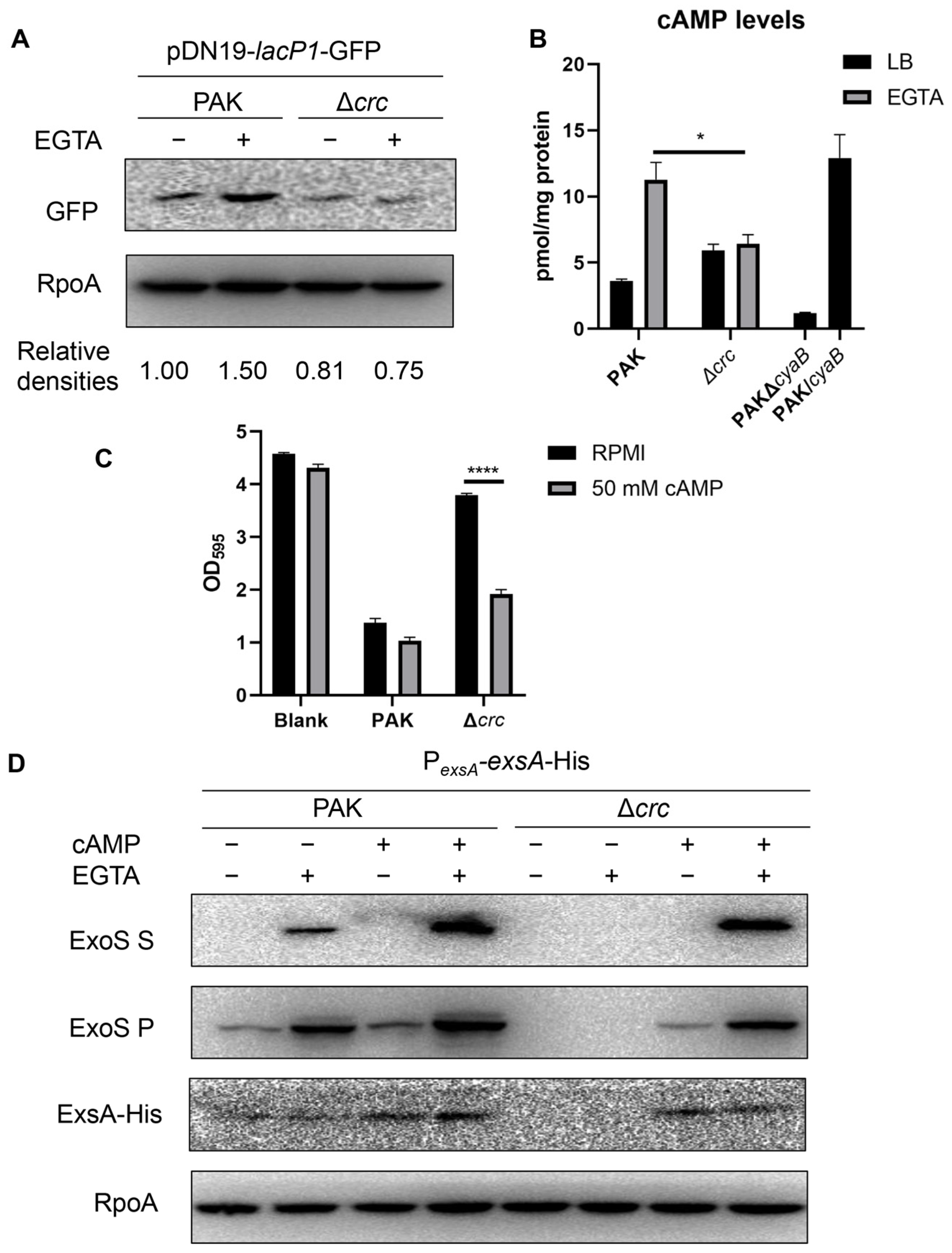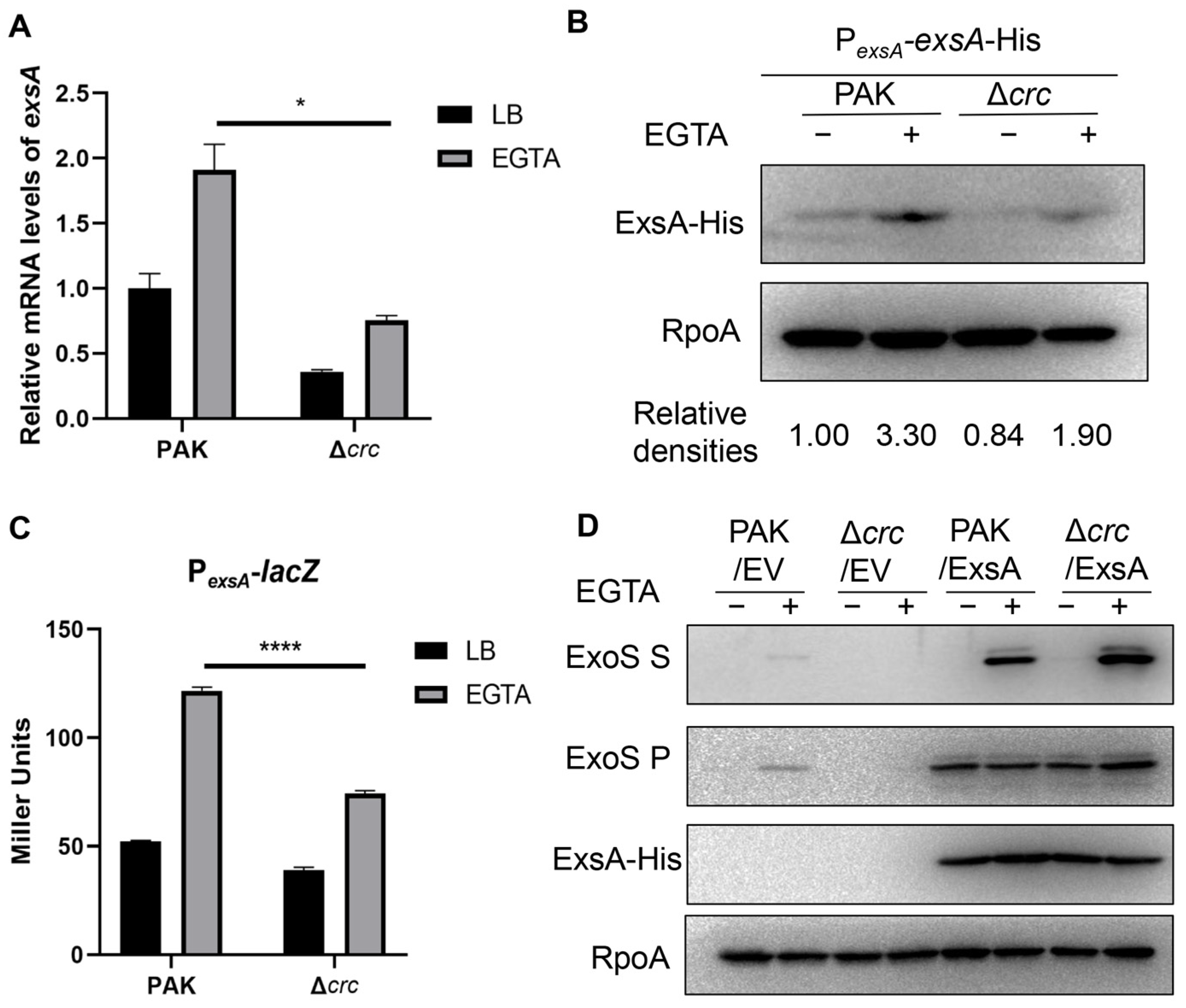 3.2. Crc Regulates ExsA Through the cAMP-Vfr Pathway