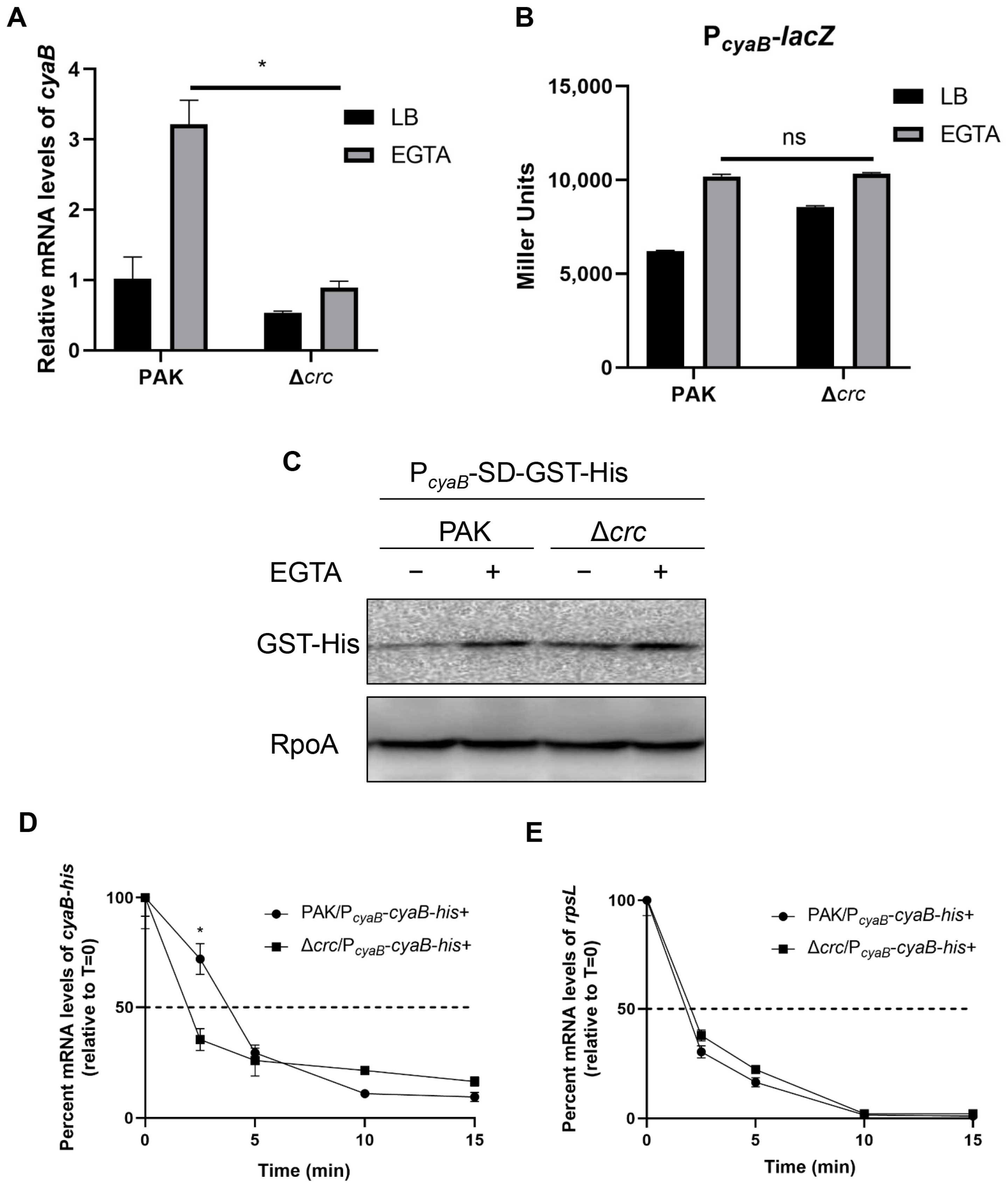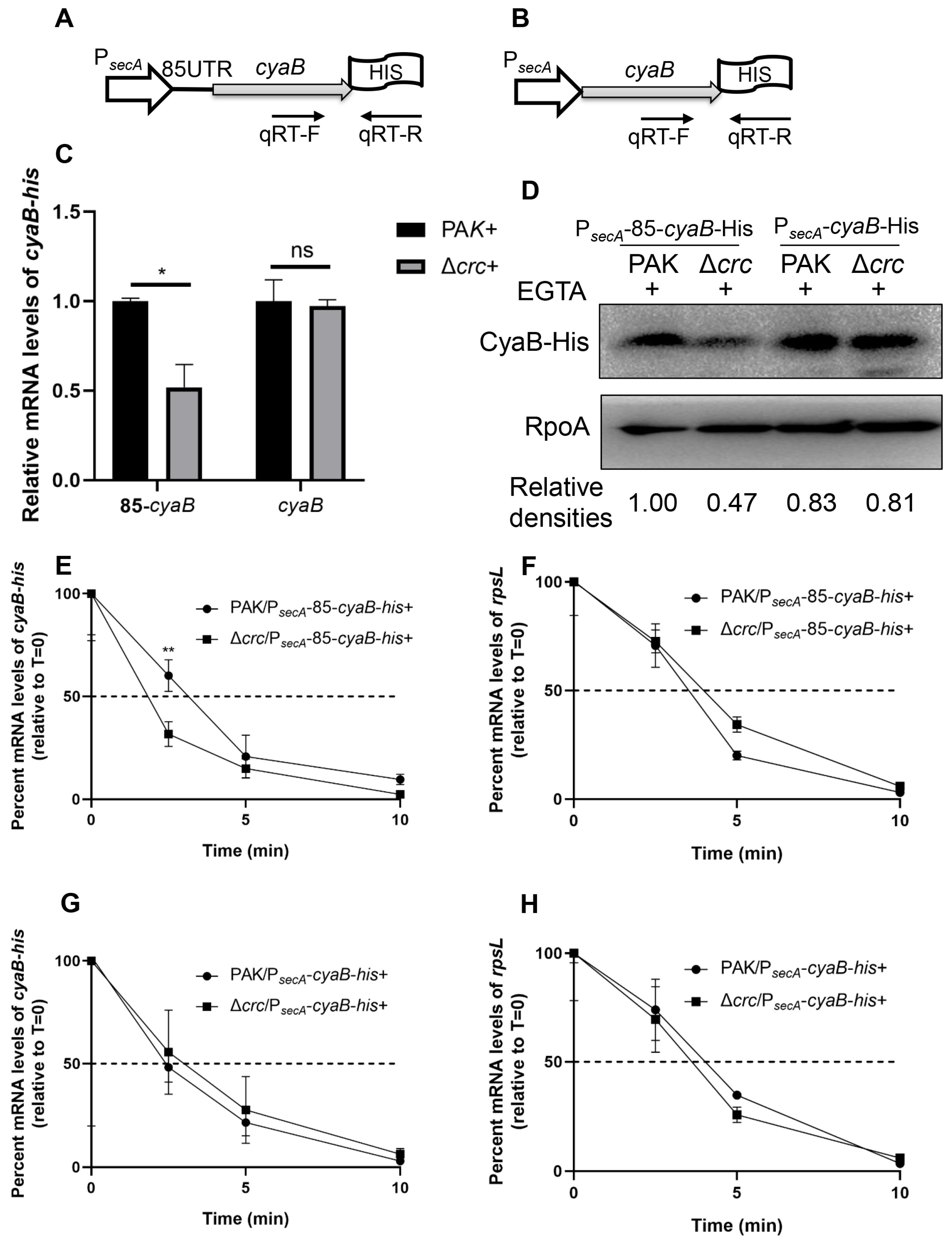 3.3. Crc Regulates the cyaB mRNA Stability