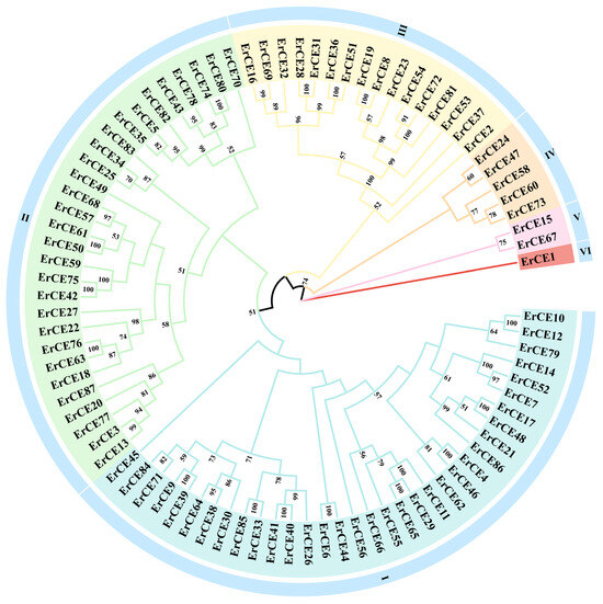 To investigate the evolutionary relationships among 87 ErCE proteins, a phylogenetic tree was constructed using the ML method in PhyloSuite v1.2.3. As shown in Figure 1, the ErCE proteins were divided into six groups, with most members distributed in Group I and Group II. Group I contained the largest number of members (34), followed by Group II (29), while Group VI had the fewest members (1). The distribution of ErCE proteins among different groups reflects the sequence diversity within the CE family. ErCE sequences located in the same group have closer evolutionary relationships, while ErCE sequences located in different groups have farther evolutionary relationships.