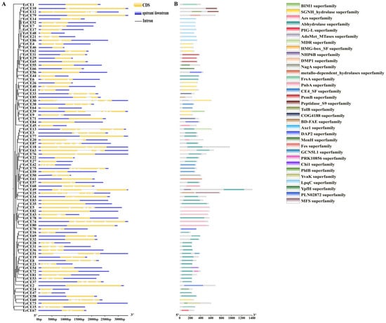 Gene structure and domain analysis of ErCEs. (A) Exon–intron structures of ErCEs. Blue boxes represent untranslated regions (UTRs); yellow boxes represent exons; black lines represent introns. (B) Domain organization of ErCE proteins. Colored rectangles indicate superfamily domains of ErCEs.