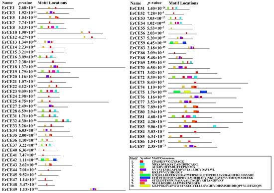 To further investigate conserved motifs of ErCE proteins, the analysis was carried out using the MEME tool, and 10 distinct motifs were identified (Figure 3 and Figure S1; Table S1). The results revealed that the number and arrangement of motifs in the ErCE proteins were different. Sixty-two ErCE proteins contained motif 1 and thirty-one contained motif 5, indicating that these two motifs are highly conserved within the family and may constitute core functional regions of the proteins. Proteins sharing similar motif compositions generally exhibited closer evolutionary relationships and may possess similar functional characteristics.