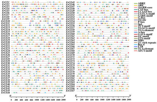 Cis-acting regulatory element (CARE) analysis in promoter regions of ErCE genes. Colored boxes represent different CAREs and their corresponding positions.