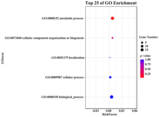 GO enrichment analysis revealed that ErCE genes were primarily enriched in metabolic process (GO:0008152), cellular component organization or biogenesis (GO:0071840), localization (GO:0051179), cellular process (GO:0009987), and biological process (GO:0008150) (Figure 5; Table S3). Among these, the most genes were significantly enriched in metabolic process (GO:0008152), suggesting that the ErCE genes mainly take part in metabolic regulation.