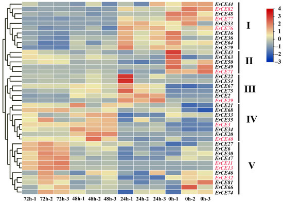 Expression pattern of ErCE genes based on RNA-seq data. Red and blue indicate high and low expression levels of ErCEs, respectively. Genes with no detectable expression are not shown. These ErCE genes were grouped into five clusters (I–V) based on the expression pattern.