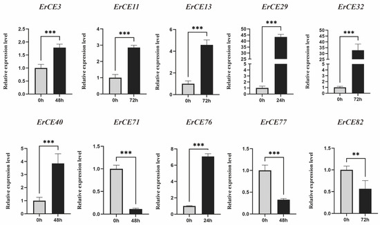 RT-qPCR validation of ErCE expressions. Bar charts represent the mean ± standard error (SE) of three technical replicates (** p < 0.01,*** p < 0.001).