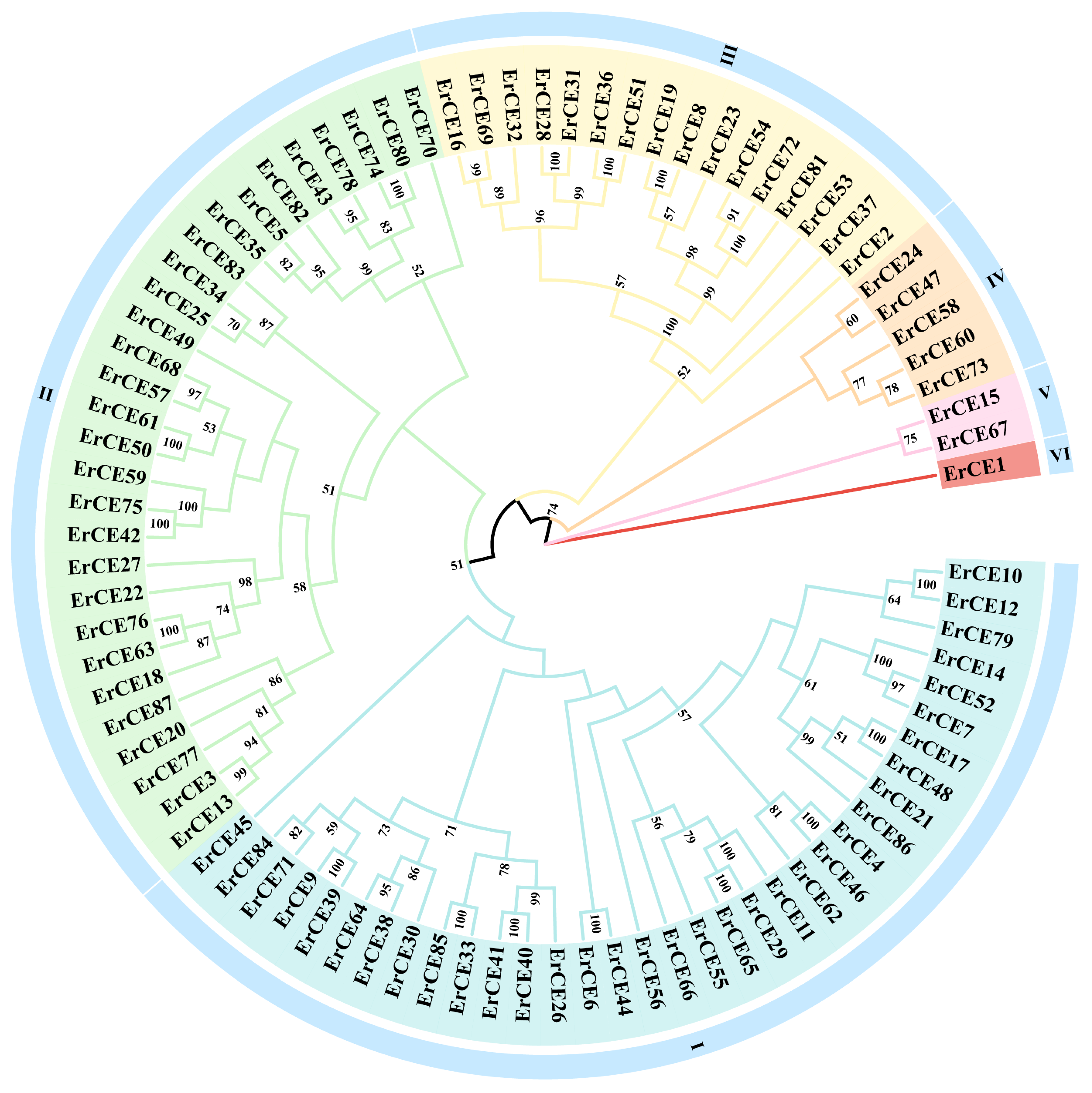 3.1. Identification and Physicochemical Property Analysis of Carbohydrate Esterase Genes