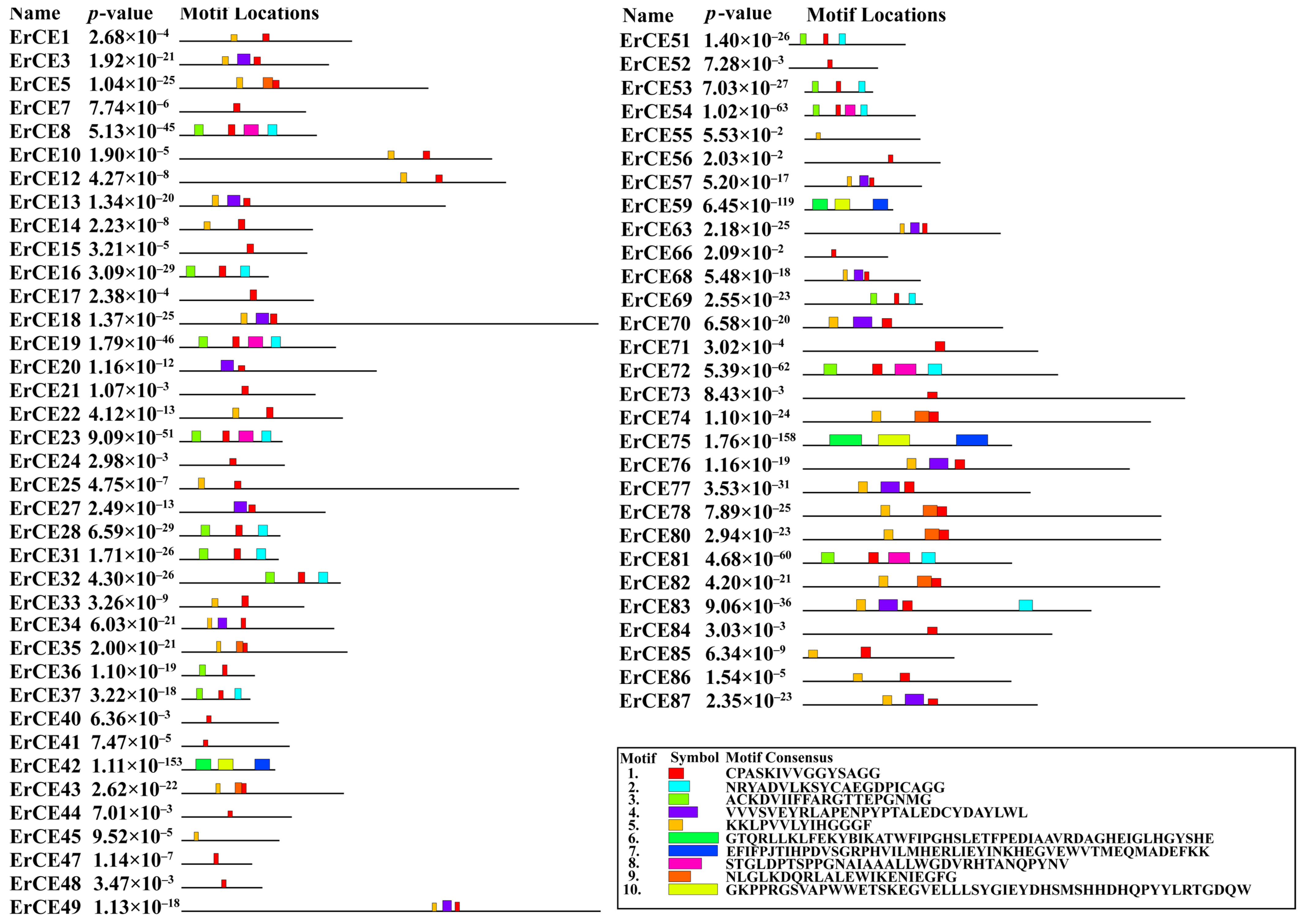 | ErCE14 | gene01953 | CE1 | 927 | 308 | 33.47 | 8.20 | −0.23 | extracellular |