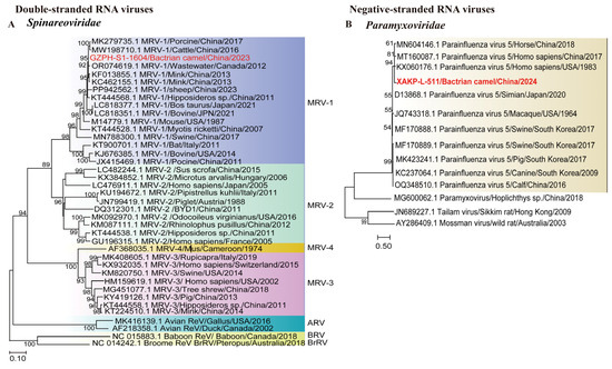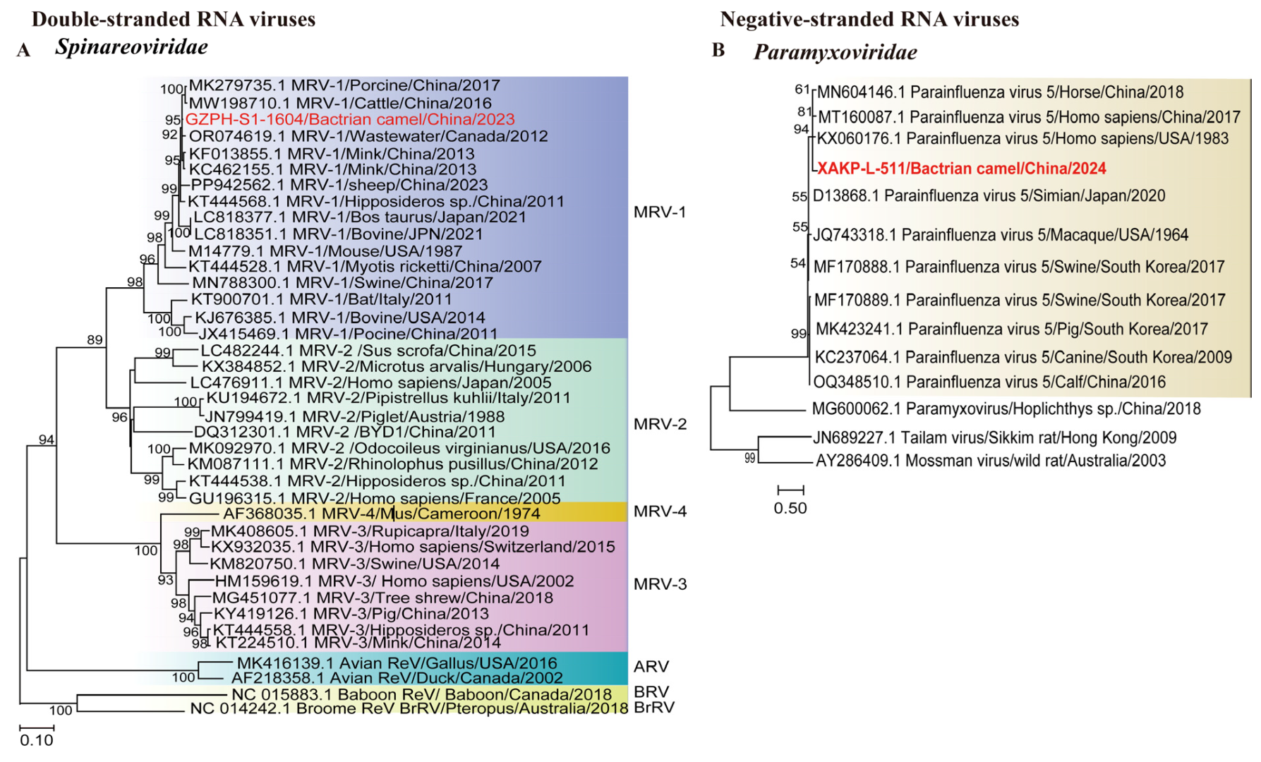 Phylogeny of mammal-associated Double-stranded and Negative-sense RNA viruses. The phylogenetic trees show Double-stranded and Negative-sense RNA viruses associated with mammals. (A): Bayesian inference tree established based on the S1 sequence of Spinareoviridae; (B): Bayesian inference tree established based on the partial L nt sequence of Paramyxoviridae. Within trees in A and B the viruses found in this study are marked with red font in bold. Each scale bar indicates the amino acid or nucleotide substitutions per site. Different taxonomic clusters are represented by rectangles filled with different colors or Lines in different colors. Taxon names are indicated in light with the corresponding colors. The corresponding host phylogenies are also shown beside the large tree. Bootstrap values >50 is indicated on the trees and the sizes of the dots on the nodes correspond to the bootstrap values.