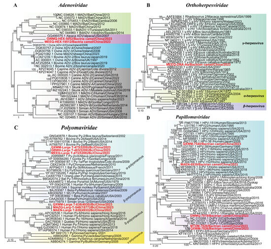 Phylogeny of mammal-associated DNA viruses. The phylogenetic trees show DNA viruses associated with mammals. (A–D) Bayesian inference tree established on the basisi of the partial Hexon gene sequence of Adenoviridae, the D-pol amino acid sequence of Orthoherpesviridae, the complete genomes of Papillomaviridae, and the Large-T-antigen aa sequences of Polyomaviridae. Within trees in (A–D) the viruses found in this study are marked with red font in bold. Each scale bar indicates the amino acid or nucleotide substitutions per site. Different taxonomic clusters are represented by rectangles filled with different colors. Taxon names are indicated in light with the corresponding colors. The corresponding host phylogenies are also shown beside the large tree. Bootstrap values >50 are indicated on the trees and the sizes of the dots on the nodes correspond to the bootstrap values.