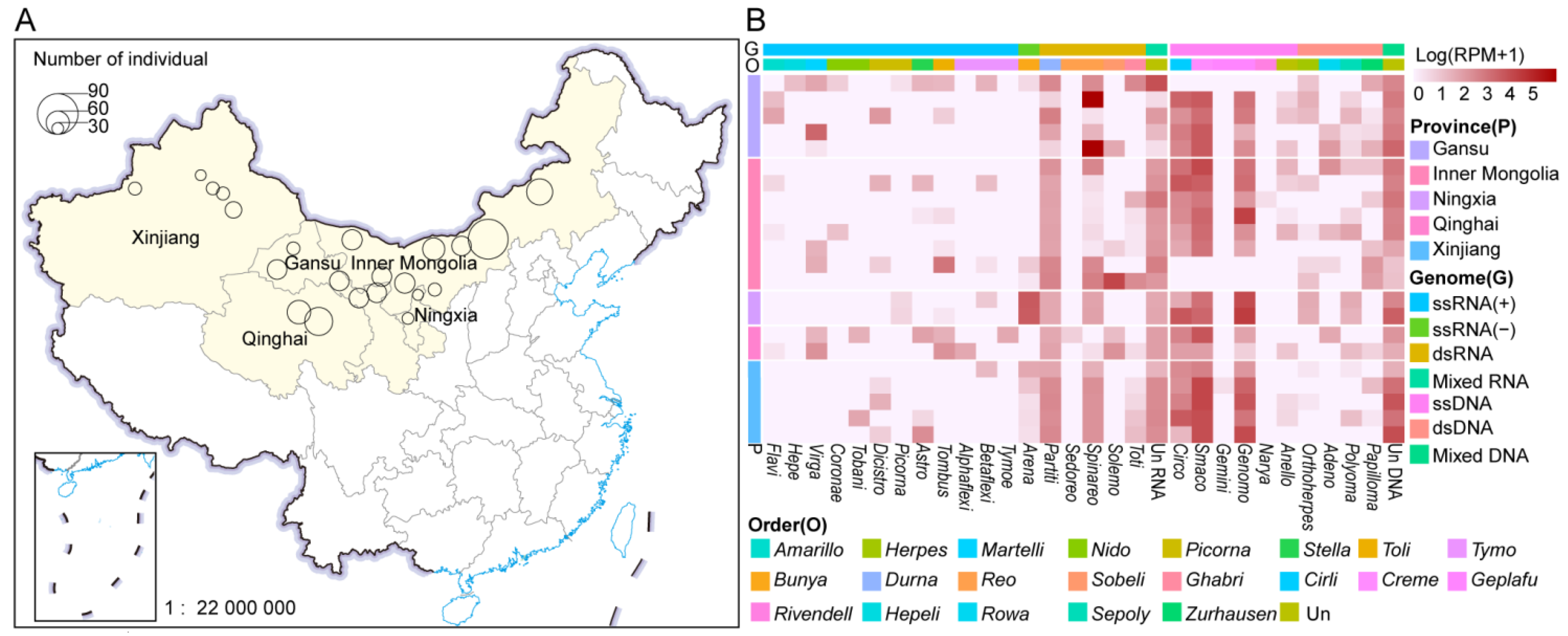 Overview of the samples and viromes of Bactrian camels. (A). Geographical sampling locations are indicated by light yellow shading on the map of China. The pie charts on the map show the sample types and numbers (n = 701), with each color representing a sample type. The base layer of this modified map was obtained from the National Earth System Science Data Center, National Science & Technology Infrastructure of China (http://www.geodata.cn (accessed on 4 May 2025)); (B). The diversity and richness of viruses associated with vertebrates and invertebrates in Bactrian camels were assessed. The viruses identified from 29 viral families that belong to seven viral types (positive-sense ssRNA virus, negative-sense ssRNA virus, dsRNA virus, mixed RNA virus, ssDNA virus, dsDNA virus, and mixed DNA virus) are shown. The relative abundance of viruses in each library was calculated and normalized to the number of mapped reads per million (RPM) total reads. The read abundances of different viral families in each library are shown from white to dull red, indicating an increasing tendency. The colors on the left of the heatmap represent different sampling locations. Viral family, order, and phylum names were trimmed by removing common suffixes. Relative abundances are expressed in RPM. Viral names ending with ‘un’ represent unclassified viruses that could not be assigned to any known viral family.