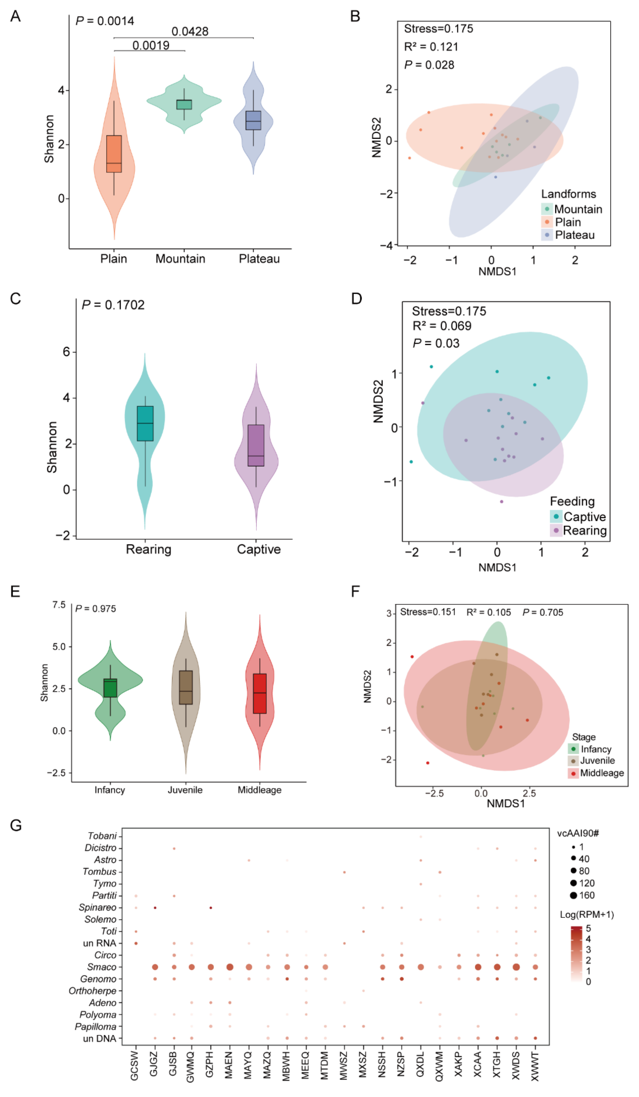Different factors shaping the virome composition of Bactrian camels. (A,C,E) Violin plots showing the α diversity of eukaryotic viruses under different landforms, rearing models, and ages. Shannon α diversity indices, computed based on the relative abundance of species (Vegan package v2.6–4), were analyzed for intergroup differences via Wilcoxon rank-sum tests with Benjamini-Hochberg correction. (B,D,F) Non-metric multidimensional scaling (NMDS) analysis was performed to show the variations in viral composition under different landforms, rearing models, and ages. In the NMDS plots, the circles represent the 95% normal probability ellipse. (G) Viral family distribution across sampling sites is shown. Bubble sizes represent relative quantities of vcAAI90 clusters (90% amino acid identity) for each viral family detected at each sampling location.