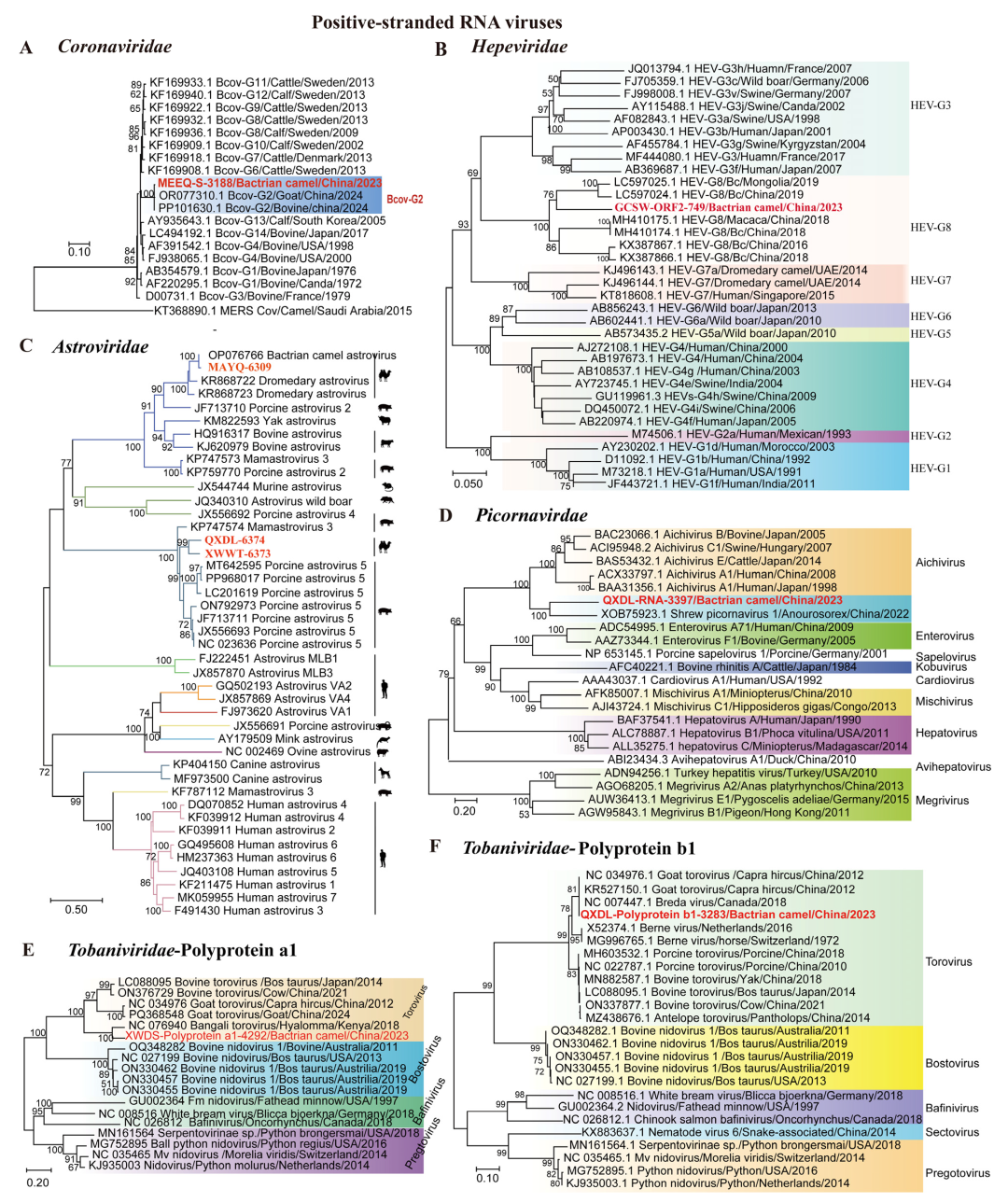 Phylogeny of mammal-associated positive-sense RNA viruses. The phylogenetic trees show positive-sense RNA viruses associated with mammals. (A–F) Bayesian inference tree established based on the BCoV S gene sequences of Coronaviridae, partial ORF2 sequences of Hepeviridae, complete genomes of Astroviridae, partial Cap protein of Picornavirdae, partial ORF1a gene nucleic acid sequences of Tobaniviridae, and ORF1b of Tobaniviridae. Within trees in (A–F) the viruses found in this study are marked with red font in bold. Each scale bar indicates the amino acid or nucleotide substitutions per site. Different taxonomic clusters are represented by rectangles filled with different colors or lines in different colors. Taxon names are indicated in light with the corresponding colors. The corresponding host phylogenies are also shown beside the big tree. Bootstrap value >50 are indicated on the trees and the sizes of the dots on the nodes correspond to the bootstrap values.