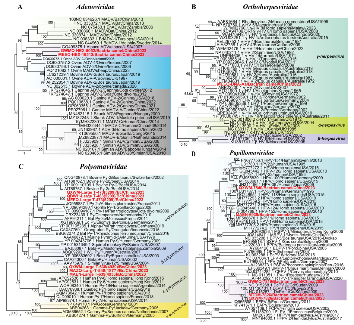 Five complete/near-complete papillomavirus genomes (6939–7826 bp) from Bactrian camels were identified. Phylogenetic analysis revealed that these sequences formed primarily into two distinct clades corresponding to human papillomaviruses (HPVs) and Camelus dromedarius papillomaviruses. QXWM-7540 and MAEN-6939 clustered with HPV type 38 and the human-derived Betapapillomavirus 1, respectively. The other three sequences (GWMQ-7819, QXWM-7826 and MTDM-7826) formed a sister lineage to Camelus dromedarius papillomavirus type 1 and 2, sharing 91.81–93.43% nucleotide identity (Figure 5D). These findings reveal a remarkable host diversity of papillomaviruses, with strains related to HPVs in Bactrian camels.