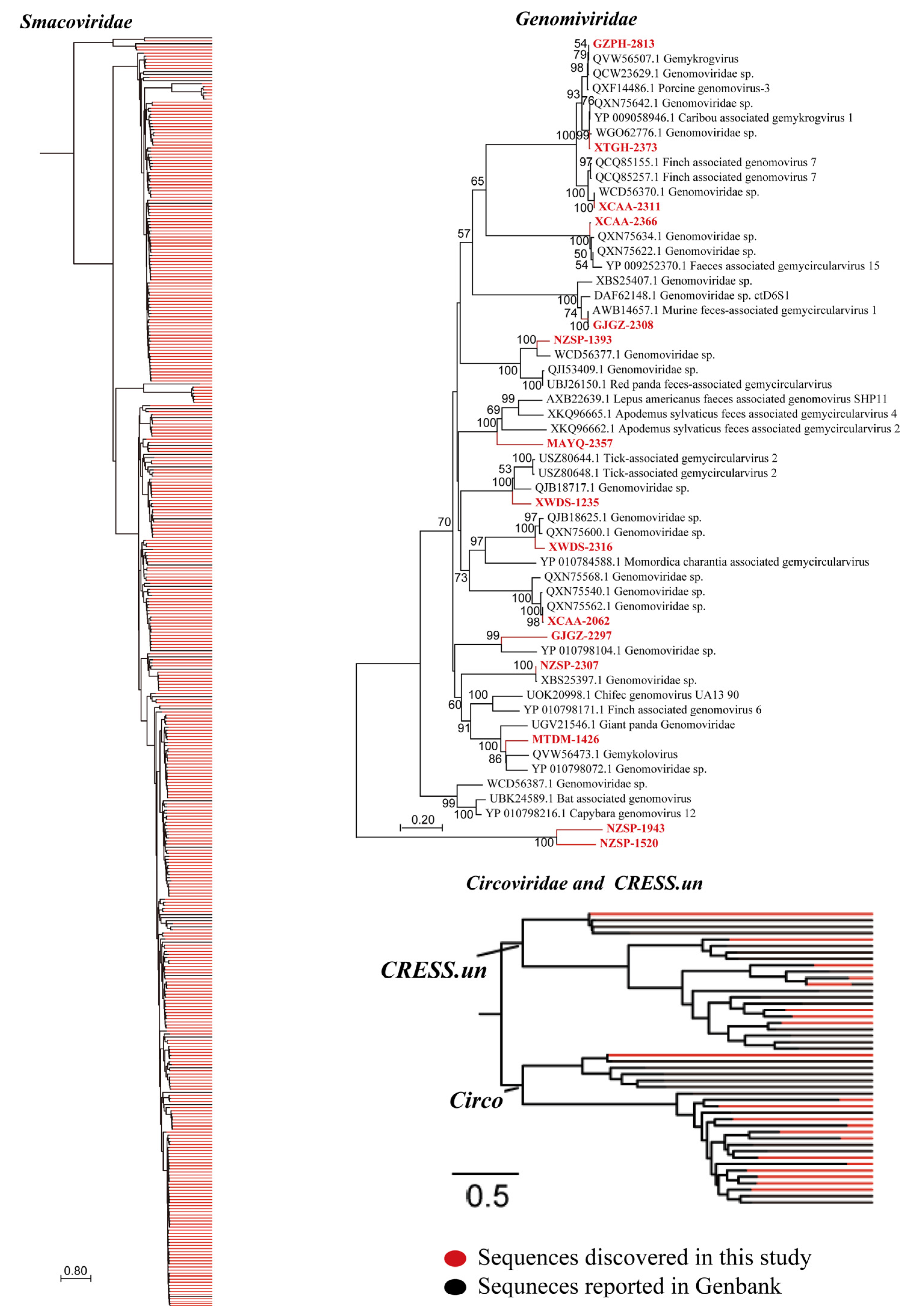 Bayesian inference tree established based on amino acid sequences of the RdRp protein of CRESS-DNA viruses. Each scale bar represents the number of amino acid or nucleotide substitutions per site. The sequences discovered in this study are shown in red, and the known sequences in GenBank are showed in black.
