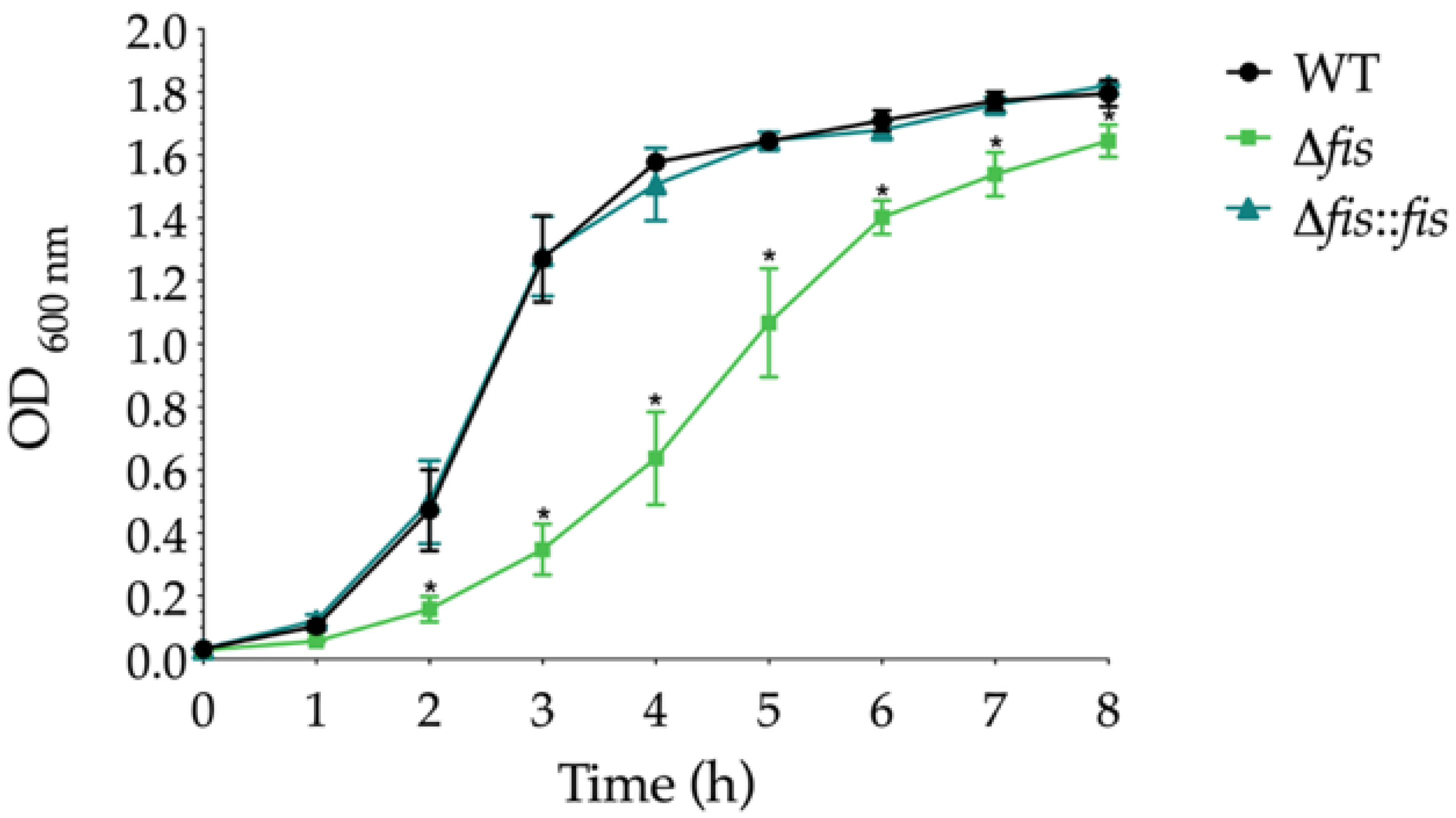 K. pneumoniae cells lacking Fis exhibit reduced growth during the exponential phase, underscoring the conserved function of this regulator in optimizing bacterial physiology during nutrient-rich conditions.