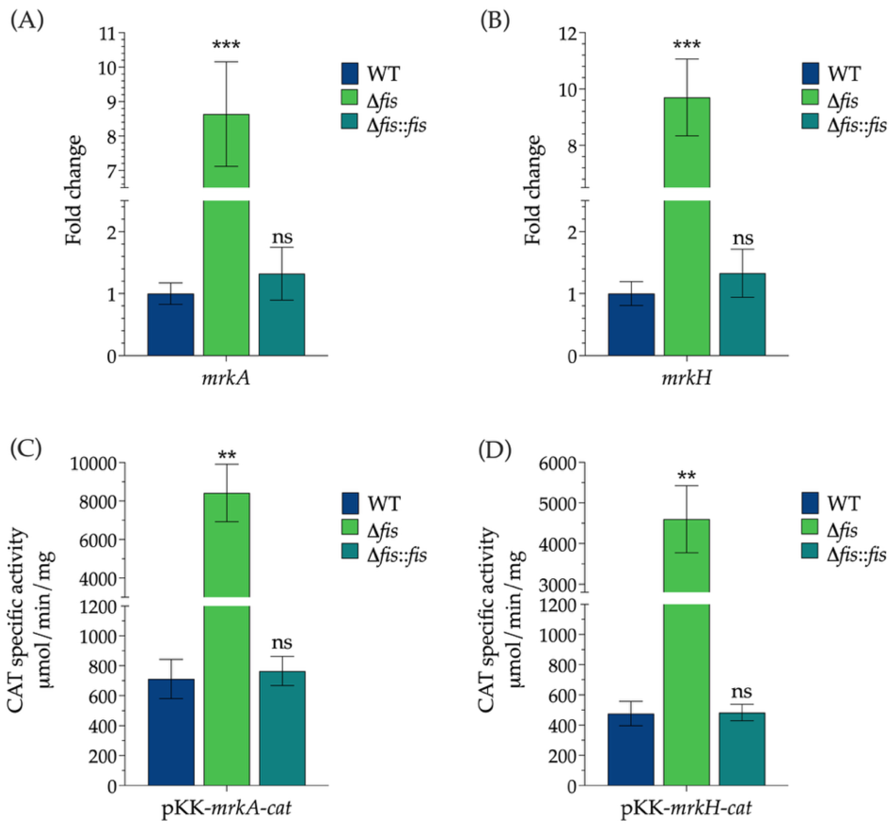 mrkH expression. This phenotype parallels reports in other bacterial systems, where the loss of Fis leads to the overexpression of adhesive or stationary-phase genes, such as curli and type 1 fimbriae in