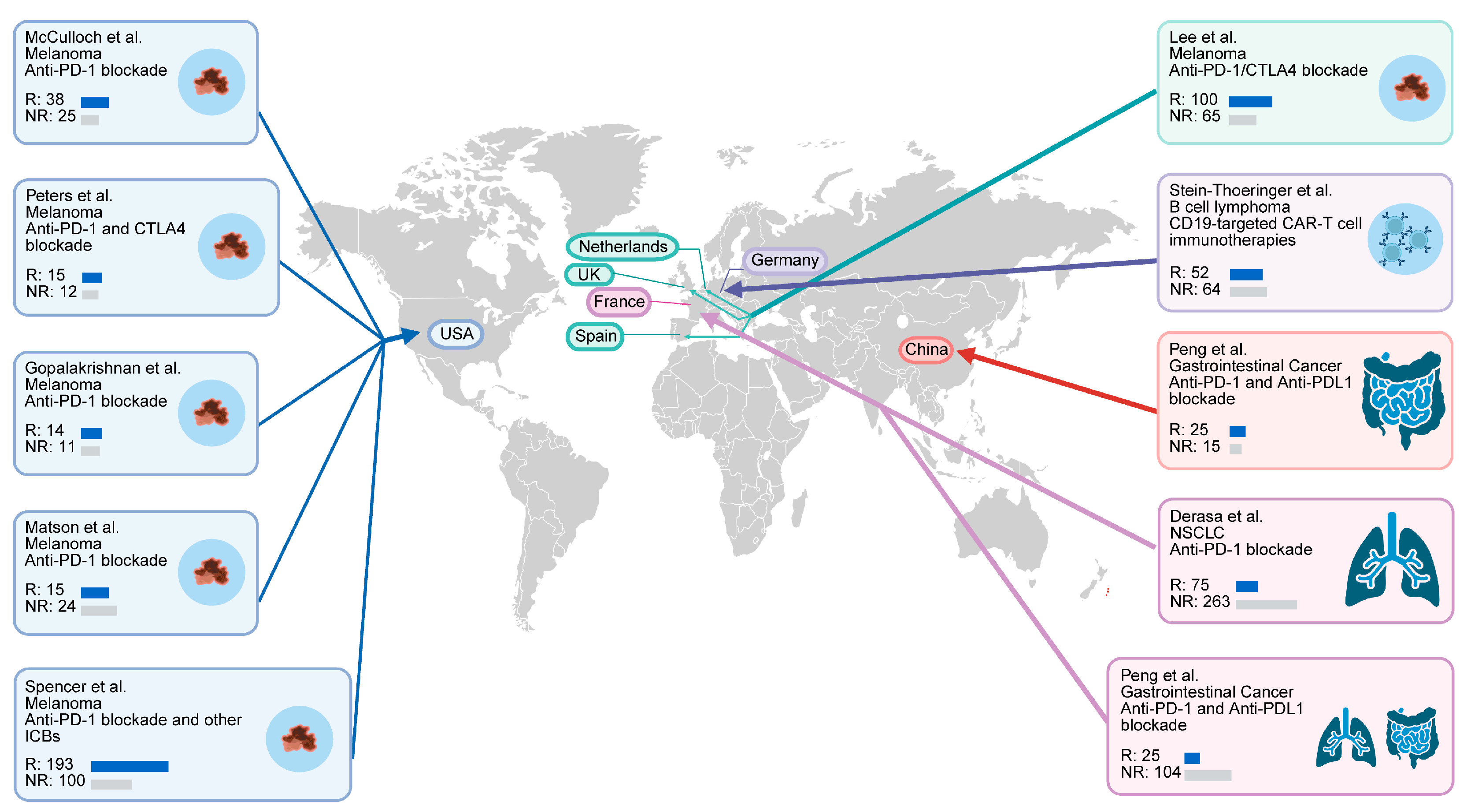We included a total of 1712 samples of 10 cohorts from 7 countries. These samples are fecal specimens that underwent metagenomic sequencing. All patients received ICI therapy (Table 1). Sequencing data of the populations from USA (PRJNA762360 [16], PRJNA541981 [17], PRJEB22893 [18], PRJNA399742 [19], PRJNA770295 [20], melanoma), France (PRJNA751792 [21], NSCLC; PRJEB22863 [22], NSCLC and RCC), Germany (PRJEB54704 [23], B cell lymphoma), Netherlands, Spain, and UK (PRJEB43119 [24], melanoma) and China (PRJNA615114 [25], Gastrointestinal Cancer) were included in this study. Metadata were manually curated from the published papers. The datasets used in this study can be accessed through the NCBI database using the provided SRA study numbers to obtain the raw metagenomic databases.
