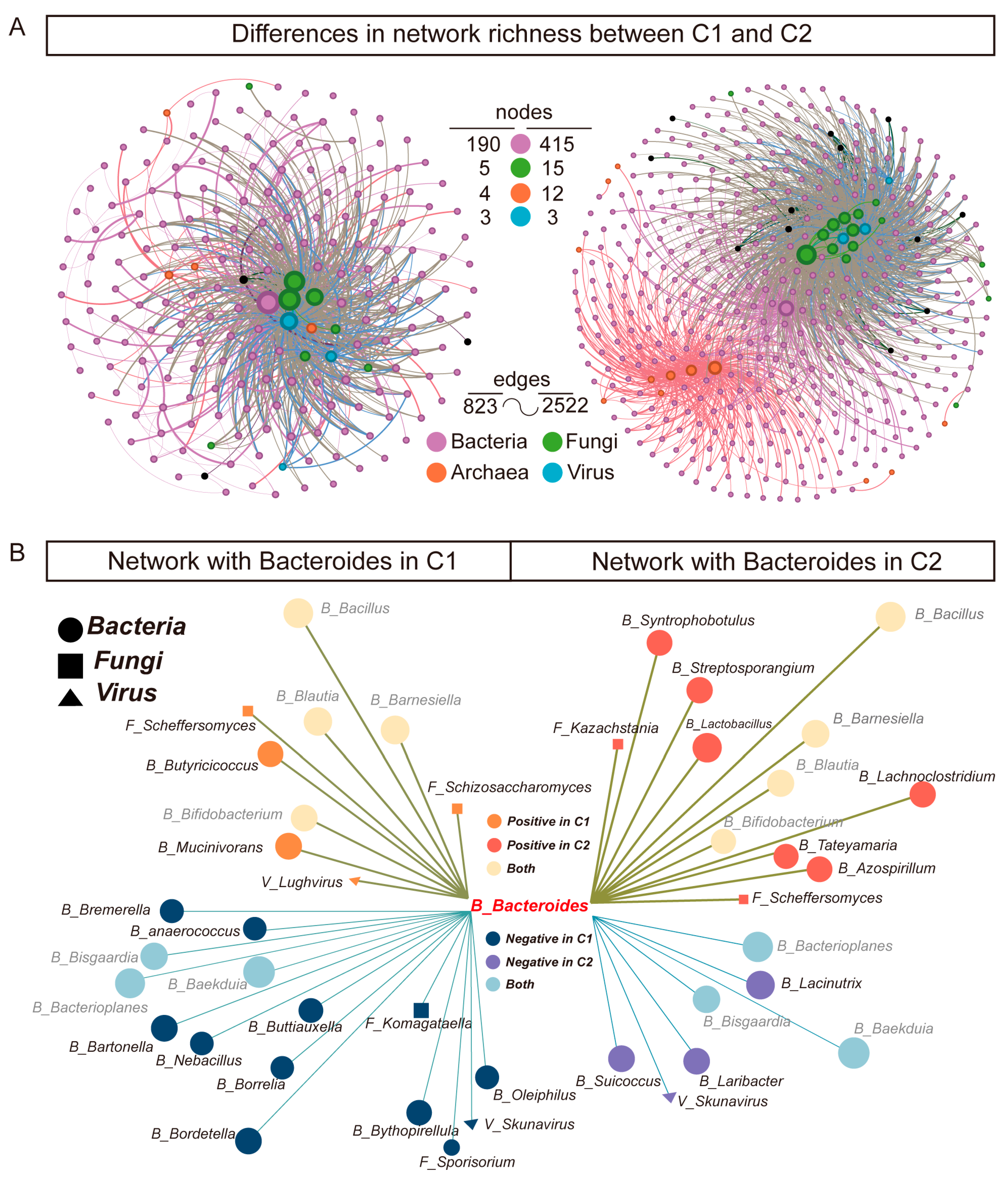 Figure 5. Co-occurrence analysis of the multi-kingdom network between subtype C1 and subtype C2. (A) Co-occurrence network in subtypes, microorganisms are defined as nodes, with the magnitude of SparCC correlations being proportionate to the width of the edges between nodes. The Fruchterman–Reingold algorithm was utilized for the layout of nodes and edges. Node size is directly proportional to the degree. (B) Network with Bacteroides in subtypes. The left side of the image shows the correlation of Bacteroides in subtype C1, while the right side shows the correlation of Bacteroides in subtype C2.