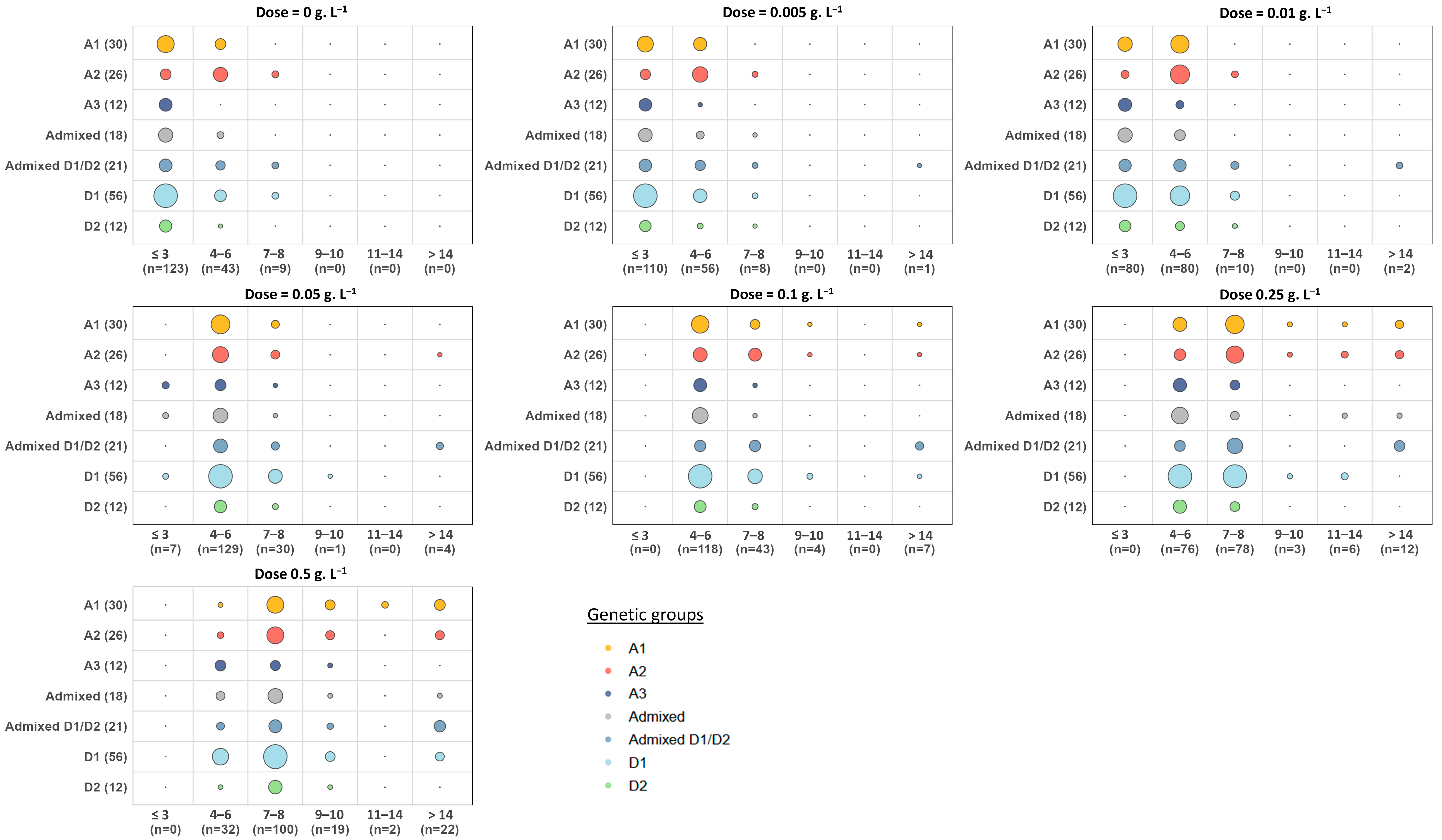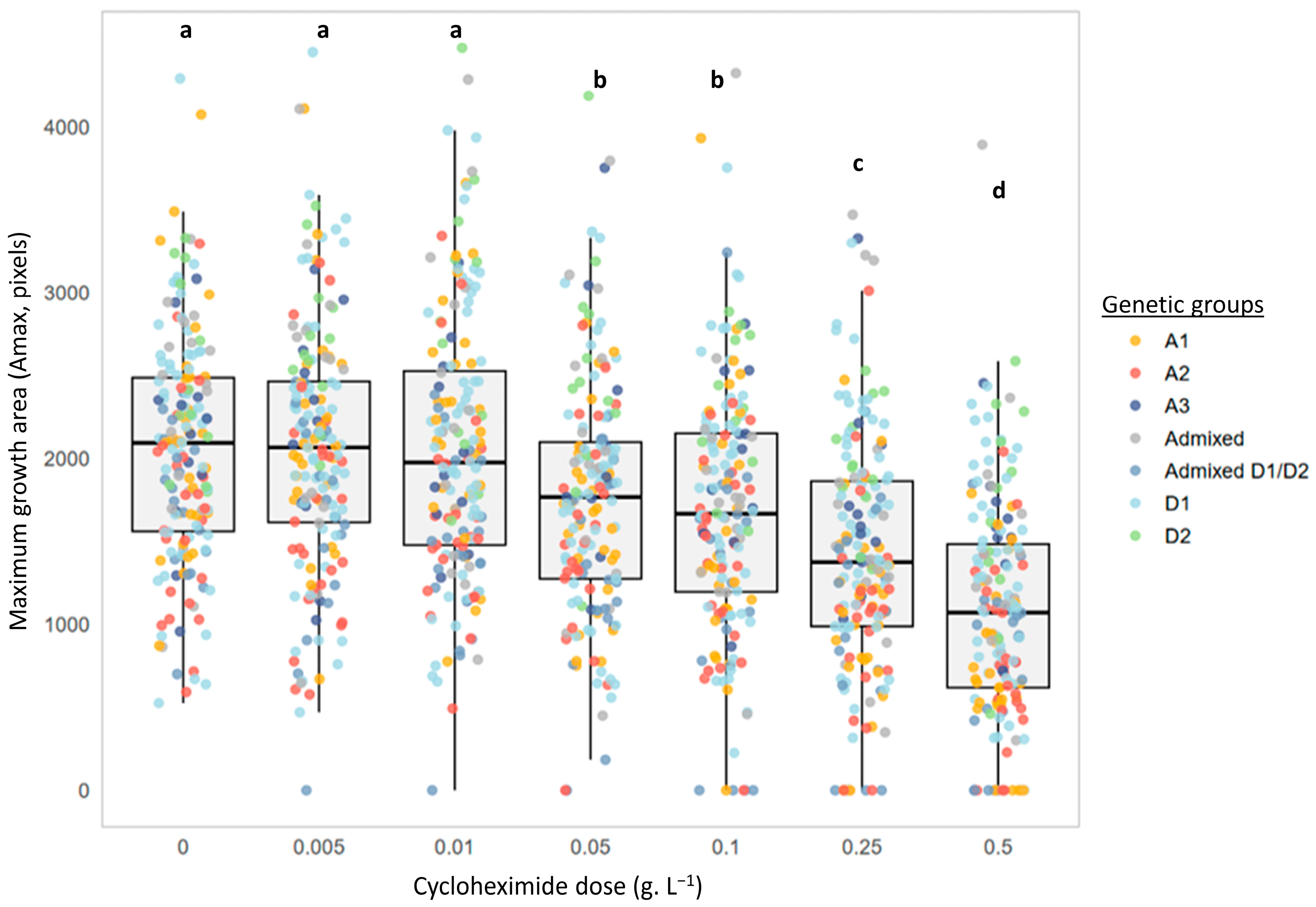 3.1.3. Combined Effect of Cycloheximide Dose and Genetic Group on Growth Delay