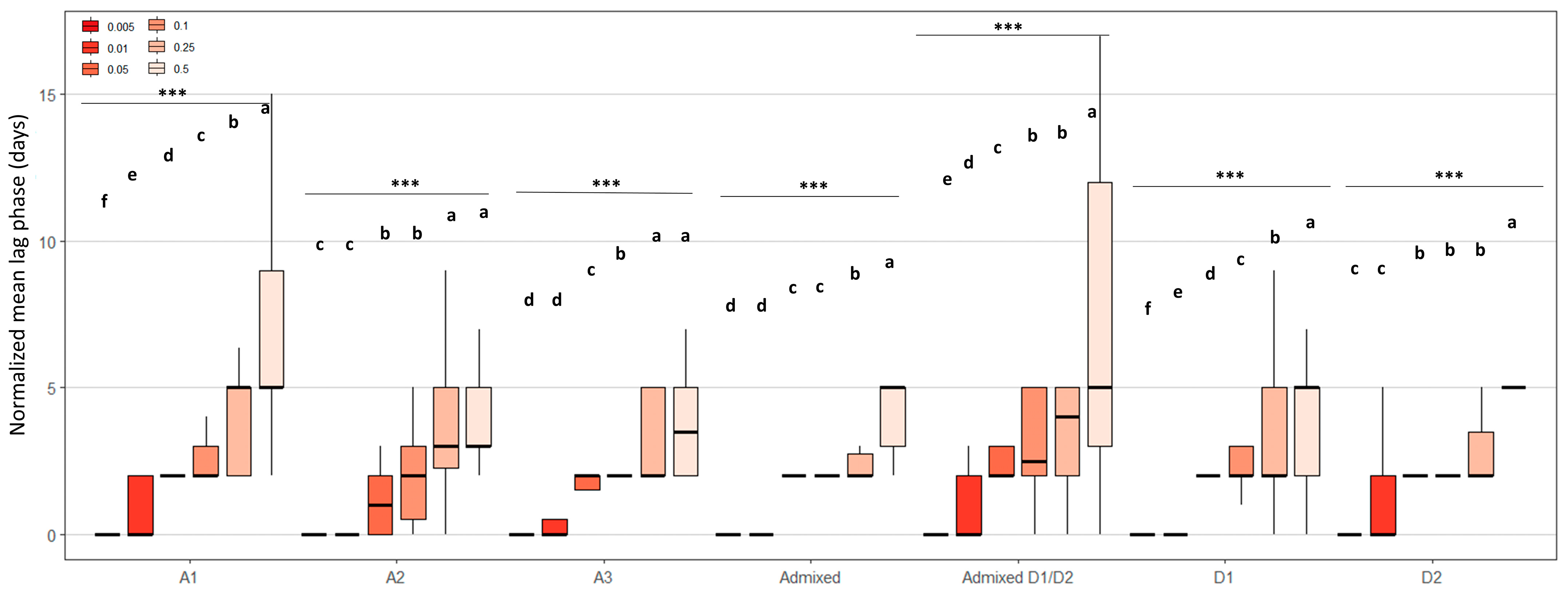 - The lag phase (days): Defined as the delay before the detection of colonies or spots on plates (corresponding to the time required to reach a growth area > 500 pixels for high inoculum densities and >250 pixels for the lowest inoculum density).
