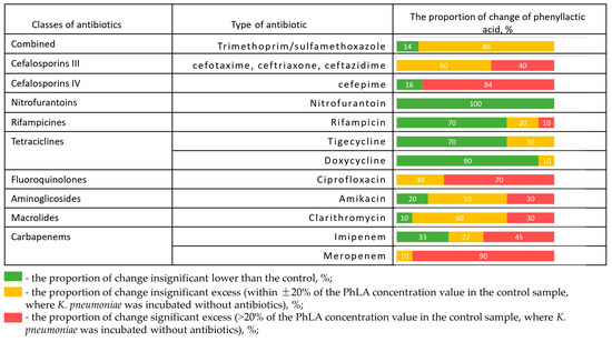 The proportion of change in the concentration of PhLA (%) upon administration of antibiotics relative to the control sample for hospital strains of K. pneumoniae (n = 10) after incubation in the presence of different antibiotics.