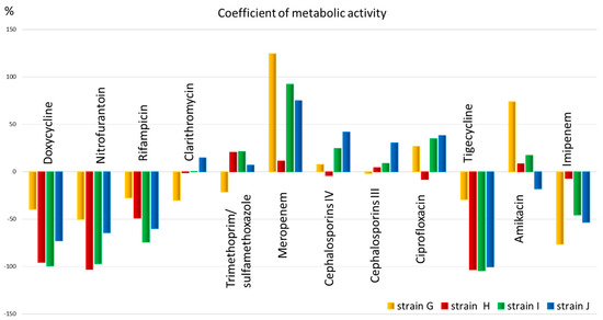 From Figure 4, it is evident that the metabolic activity coefficient shows that all strains have low metabolic activity and, therefore, sensitivity to antibiotics such as doxycycline, nitrofurantoin, rifampicin (for all except strain G), as well as tigecycline (also except strain G) and imipenem (for all except strain H). The metabolic activity coefficient also shows that all strains have low metabolic activity and, therefore, sensitivity to antibiotics such as doxycycline, nitrofurantoin, rifampicin (for all except strain G), as well as tigecycline (also except strain G) and imipenem (for all except strain H). Clarithromycin, trimethoprim, meropenem, 3rd and 4th generation cephalosporins, ciprofloxacin, and amikacin, in most cases, exhibit high metabolic activity, potentially indicating low efficacy of the drug.