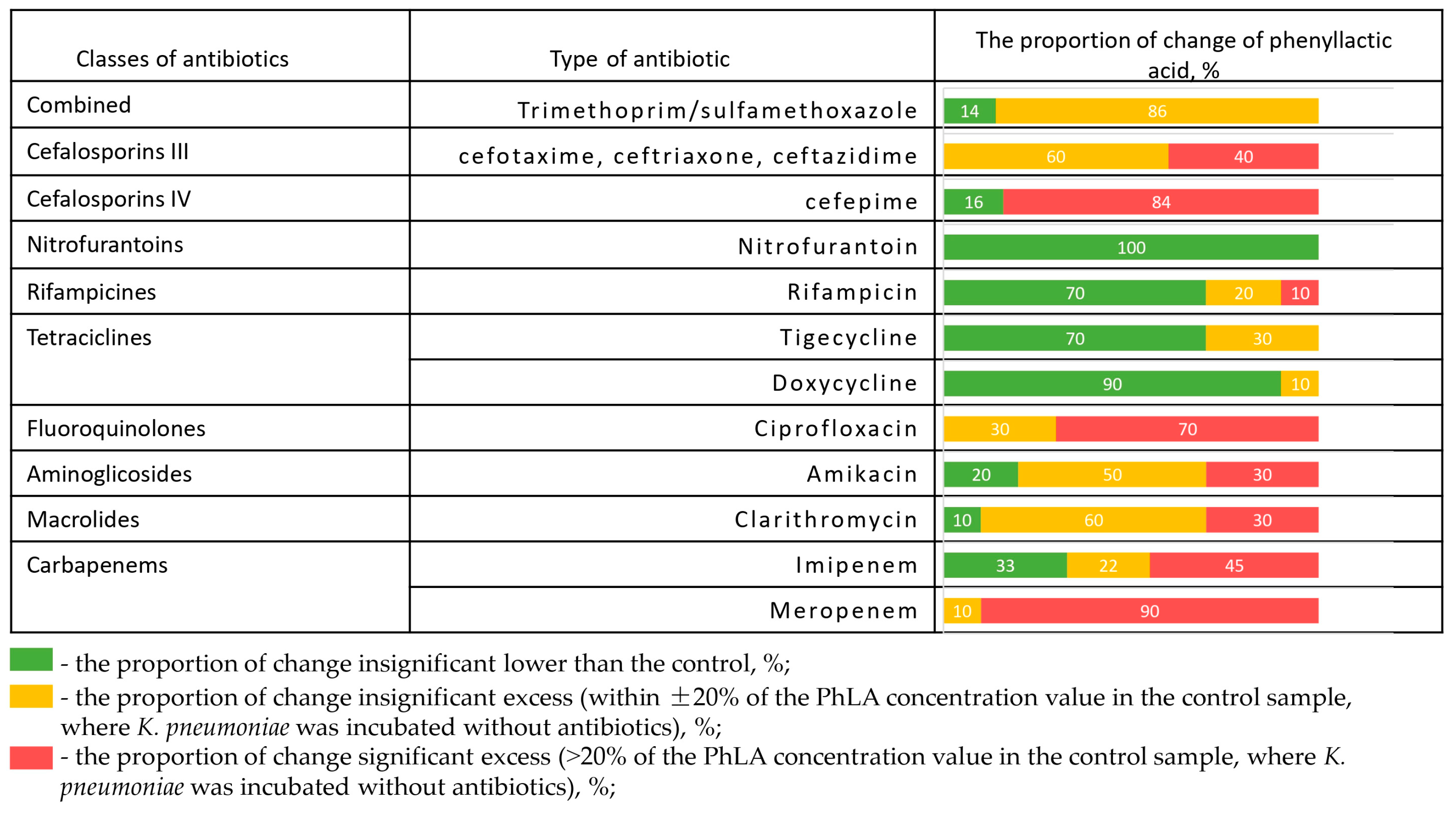 3.2. Metabolic Activity of K. pneumoniae Based on Changes in the Concentration of PhLA when Exposed to Different Classes of Antibiotics