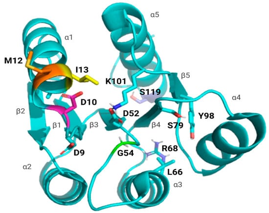 Map of WT PmrA REC domain showing mutations and key residues. Shown in cyan is the A chain of A. baumannii WT PmrA (PDB: 7M0S); each of the five β-strands and α-helices has been labeled. Key residues included within the intra-protein communication pathway are labeled and shown as sticks in cyan (D9, D52, L66, R68, S79, Y98, and K101). Mutations included in this investigation have been labeled and shown in various colors (D10 in pink, M12 in orange, I13 in yellow, G54 in green, and S119 in lilac).