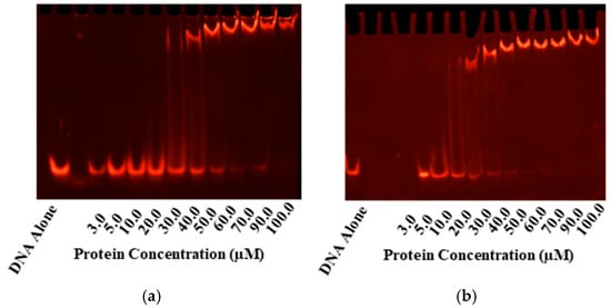 DNA promoter fragments using the sequence determined by Palethorpe et al. (5ʹHTTAAD-N5-HTTAAD), the same sequence used for DNA anisotropy experiments without the 6FAM label []. Equimolar concentrations of single-stranded DNA (Integrated DNA Technologies, Inc.) were annealed by heating at 95 °C for 5 min in DNAase-free water, followed by slow cooling to room temperature. Binding reactions containing 1 μM DNA and indicated concentrations of protein were incubated for 5 min at room temperature before loading onto pre-chilled 8% TBE-acrylamide native gels. Samples were electrophoresed at 80 V in 1× TBE running buffer and stained with ethidium bromide for 5 min before visualizing bands. Gels were imaged and analyzed using ImageLab 6.1 software.