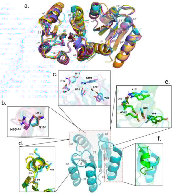 While overall the secondary structure of PmrAN D10N remains greatly unchanged, the asymmetric unit (ASU) contains eight chains that are a combination of monomer chains and dimeric chains. Response regulators are well-known to crystallize as a dimer and often are solved with two chains in the ASU. The presence of eight chains is an indicator of an overall change in protein packing and relays that the dynamics of this mutant structure differ from those of the WT. As previously mentioned, the α1-helix is important for sensor kinase interaction and contains residues that are part of the conserved aspartyl pocket []. The α1-helix in PmrAN D10N shows that the mutated asparagine residue has altered the sidechain positioning in chains a, b, d, e, g, and h (Figure 5b,c). Also seen in the D10N crystal is the breaking of a salt bridge between D52 and K101 and a hydrogen bond between S79 and Y98 switch residues [,,].
