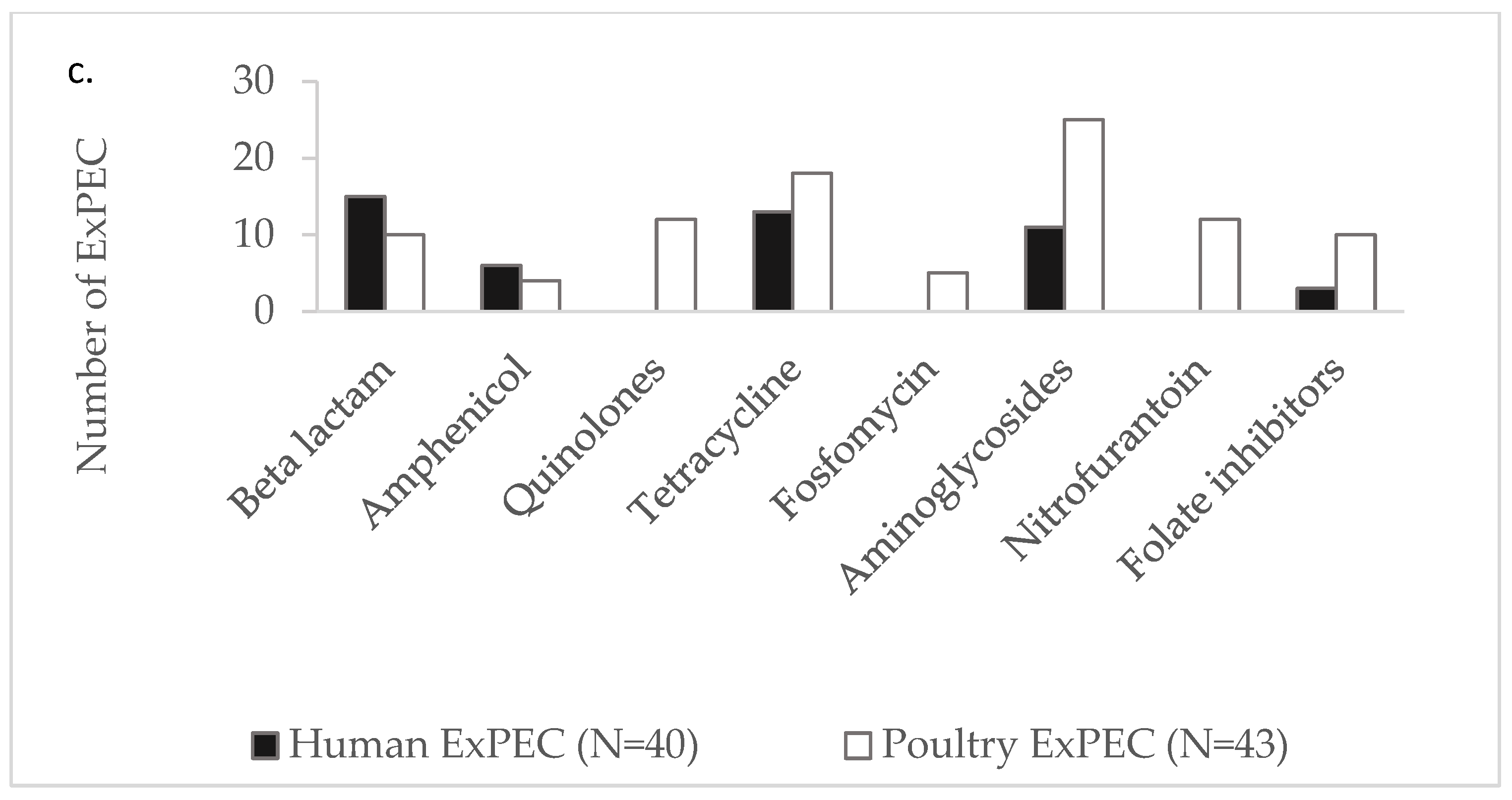 - Jakobsen, L.; Spangholm, D.J.; Pedersen, K.; Jensen, L.B.; Emborg, H.D.; Agerso, Y.; Aarestrup, F.M.; Hammerum, A.M.; Frimodt-Moller, N. Broiler chickens, broiler chicken meat, pigs and pork as sources of ExPEC related virulence genes and resistance in Escherichia coli isolates from community-dwelling humans and UTI patients. Int. J. Food. Microbiol. 2010, 142, 264–272. [Google Scholar] [CrossRef] [PubMed]