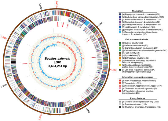 To delineate the functional repertoire of the genome, a systematic functional annotation was conducted [14]. Gene prediction was performed using Glimmer3 v3.02 or Prodigal v2.6.3 for genomes with GC content exceeding 70%, while tRNA identification was carried out with tRNAscan-SE v1.3.1 [19]; and using the rRNAmmer v1.2 was used for identifying the rRNAs [20]. sRNA predictions were first aligned against the Rfam database and then filtered using the cmsearch program. Genomic islands were predicted using IslandPath-DIMOB [21], CRISPR elements with CRISPRdigger [22] and prophages with PHAST [23]. Gene annotation of LG01 was performed through sequence homology analysis using BLAST v2.17.0 and DIAMOND v2.1.9 against multiple databases: NCBI Nr, Swiss-Prot, COG, KEGG, GO, Pfam, CAZy, PHI, VFDB, and CARD. Gene Ontology functional classification was performed using Blast2GO v2.5 [24]. Protein family (Pfam) database annotation based on the Pfam was applicable with a hmmer [25]. In addition, the superior annotation was annotated on the basis of the following databases: Carbohydrate-Active enZYmes Database (CAZyme Database), Pathogen Host Interactions Database (PHI Database), Virulence Factors of Pathogenic Bacteria Database (VFDB Database), Comprehensive Antibiotic Resistance Database (CARD Database). To identify secreted proteins containing signal peptides at the N-terminus rather than transmembrane helices, SignalP, LipoP, TMHMM PSORTb and other software were used [26]. The Circos v0.66 software was used for visual display to obtain the whole genome cycle map [27]. AntiSMASH v5.0.0 was used to predict the gene clusters of secondary metabolites [28]. Phylogenetic analysis was conducted with MEGA X and iTOL using the complete genome sequences of B. safensis strains, with all analyses performed under default parameters [29,30].