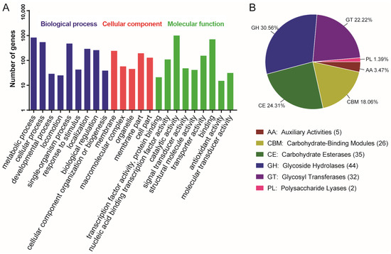 Genome functional annotation of B. safensis LG01. (A) GO pathway functional Categorization. (B) The result of carbohydrate enzyme analysis of B. safensis LG01.