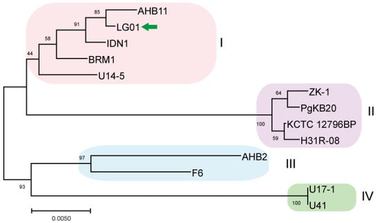 To evaluate the phylogenetic position of LG01, we reconstructed a gyrB-based Maximum Likelihood tree with MEGA X, comparing it against other available B. safensis genomes [29]. Thirteen B. safensis strains were used in this analysis, and the genome of the LG01 strain was compared to every fully sequenced B. safensis strain available in the GenBank database (Figure 3). Additionally, we have provided a comparative table (Table S6) that systematically outlines the unique genomic features and functional attributes of LG01 compared to other closely related Bacillus strains, including type strains and characterized isolates. Phylogenetically segregated into four distinct classes (I–IV), these strains were subsequently subjected to whole-genome comparative analysis using TBtools, revealing conserved syntenic blocks across the taxonomic divisions (Figure S4).