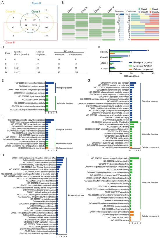 Comparative analysis of orthologous gene clusters across four B. safensis subclusters. (A,B) Venn diagrams illustrate shared and unique orthologous gene clusters. Green cells denote present; gray absent across classes. (C,D) GO functional annotation of orthologous genes across classes. (E–I) Class-specific functional profiles for Class I (E), Class II (F), Class III (G), and Class IV (H,I).