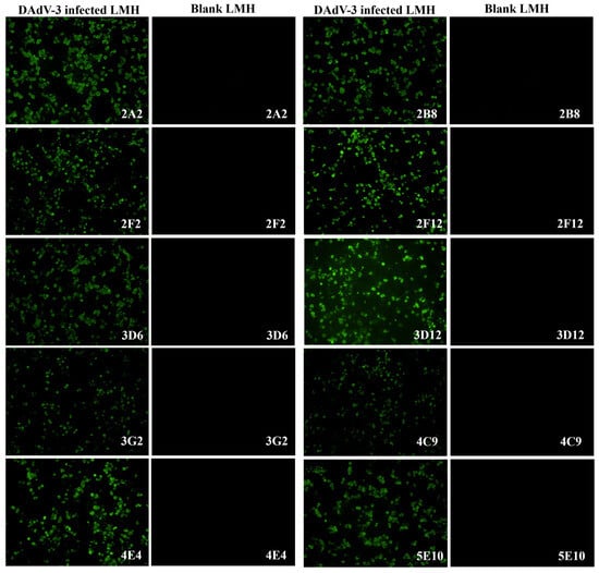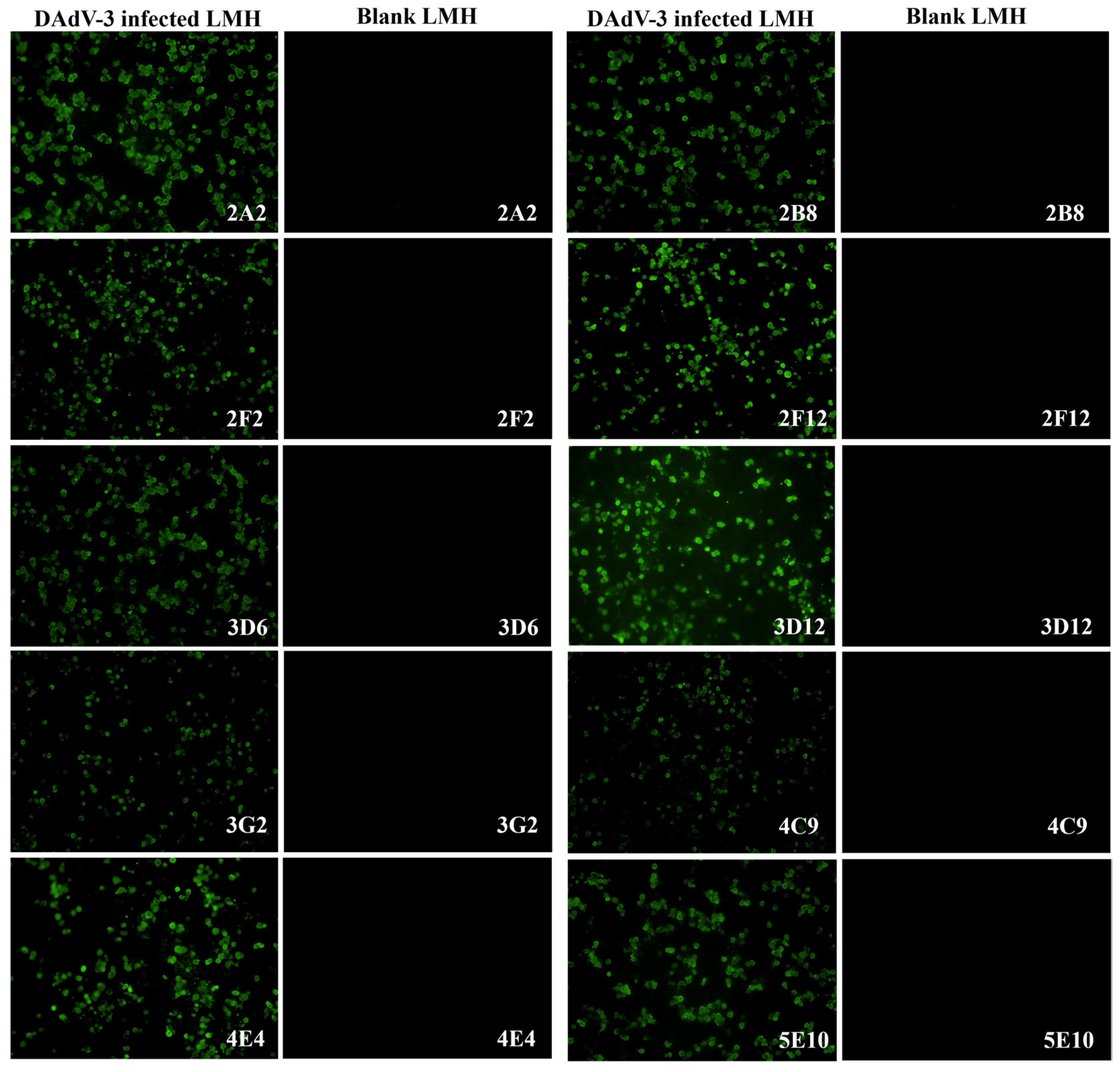 Characterization of ten monoclonal antibodies by IFA. To characterize the ten mAbs against DAdV-3, an IFA was performed using LMH cells infected with DAdV-3. The cell supernatants of the ten mAbs were used as the primary antibodies to incubate both the positive cell plates of LMH infected with DAdV-3 and the blank LMH cell plates. Under fluorescence microscopy, all ten mAbs specifically reacted with the infected cells in the positive cell plates emitting green fluorescence, while no reaction was observed with the blank LMH cells.