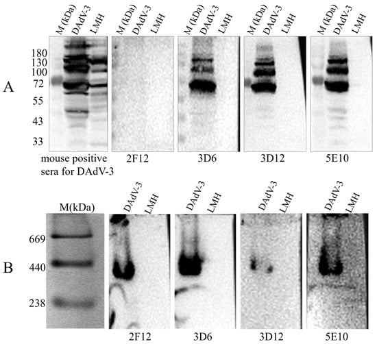 Detection of the reactivity of mAb 2F12, 3D6, 3D12 and 5E10 with DAdV-3 viral proteins by Western blotting. (A) Denaturing WB and (B) non-denaturing WB analysis of mAb 2F12, 3D6, 3D12 and 5E10.