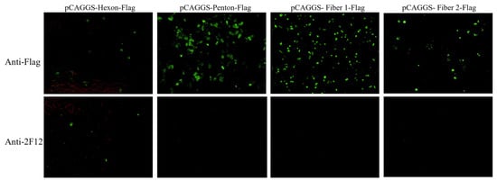To identify which surface protein of DAdV-3 interacts with 2F12, plasmids pCAGGS-Hexon-Flag, and pCAGGS-Penton-Flag, pCAGGS-Fiber 1-Flag, pCAGGS-Fiber 2-Flag, were constructed and transfected into LMH cells. IFA was performed using anti-Flag antibody and 2F12 as primary antibodies. The results showed that all groups treated with anti-Flag antibody exhibited specific green fluorescence (Figure 4). However, in the groups treated with 2F12, only the Hexon-expressing cells showed specific green fluorescence, despite the relatively low expression level of Hexon. The other three groups did not show specific green fluorescence (Figure 4), indicating that 2F12 specifically targets Hexon.