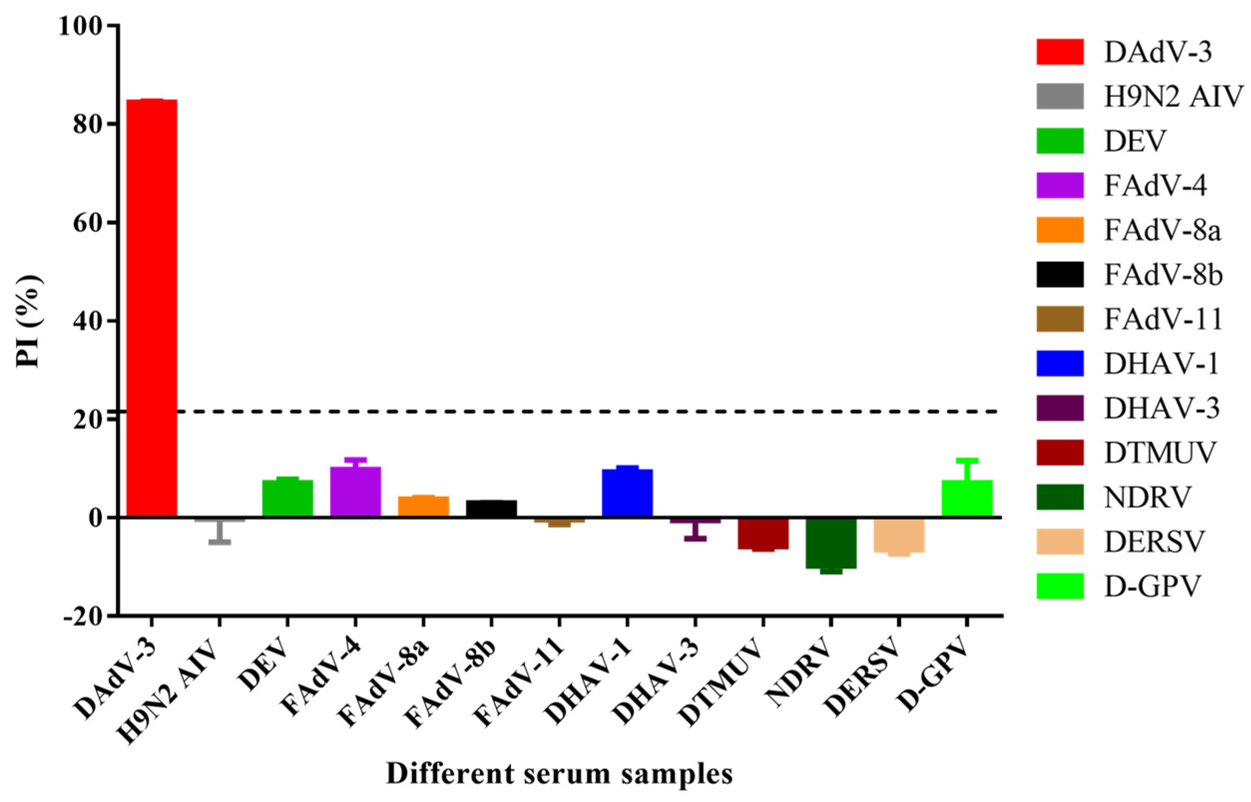 Specificity of the b-ELISA to anti-DAdV-3 serum. Thirteen sera against different viruses were investigated. The PI value of anti-DAdV-3 serum reached a maximum of 84.44%, while the other antisera against H9N2 AIV, DEV, FAdV-4, FAdV-8a, FAdV-8b, FAdV-11, DHAV-1, DHAV-3, DTMUV, NDRV, DERSV and D-GPV ranged from −9.77% to 9.57%, were all negative. The dotted line referred to the cut off value of 21.62%.