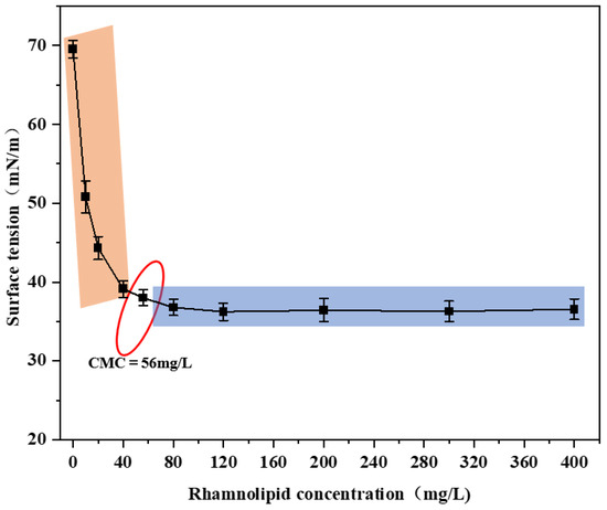The surface tension of MM with different concentrations of rhamnolipids was measured at 25 °C using a tensiometer (model Q200, Fangrui Instrument Co., Ltd., Shanghai, China) to determine the critical micelle concentration (CMC). The specific experiments were based on the method of Kourmentza et al. [19]. The experiment was repeated three times, and the mean value was calculated.