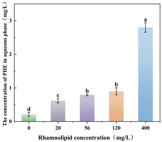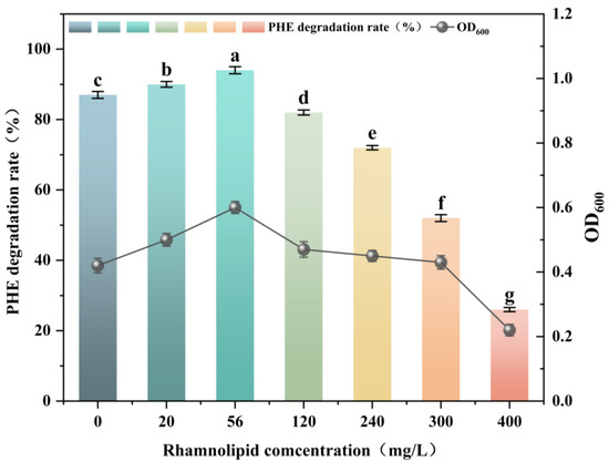 Effect of rhamnolipid on biodegradation of PHE by the bacterium FM-2 (36 h). The different letters above the bars indicate significant differences among the different groups (p < 0.05, n = 3). Statistical significance was determined using Tukey–Kramer test.