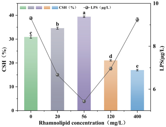 Effect of rhamnolipids on CSH and LPS (representative of cellular LPS content) of the bacterium FM-2 cultured for 36 h. The different letters above the bars indicate significant differences among the different groups (p < 0.05, n = 3). Statistical significance was determined using Tukey–Kramer test.