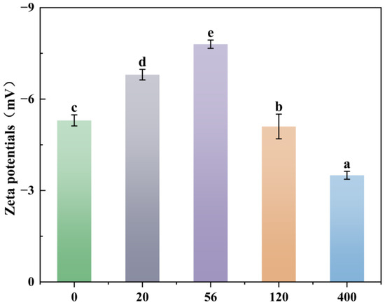 Variation of Zeta potential of cells cultured for 36 h treated with different concentrations of rhamnolipids. The different letters above the bars indicate significant differences among the different groups (p < 0.05, n = 3). Statistical significance was determined using Tukey–Kramer test.