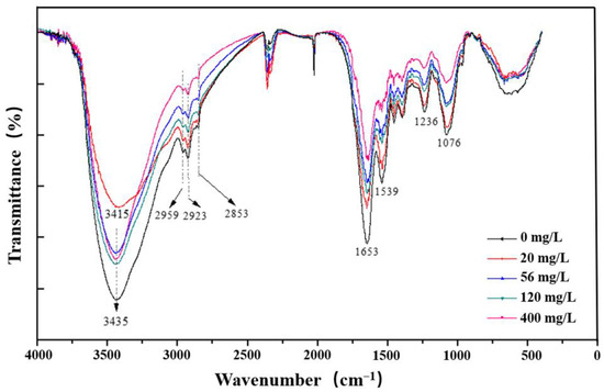 FTIR spectra of bacterium FM-2 in the presence of 0, 20, 56, 120 and 400 mg/L rhamnolipid for 36 h.