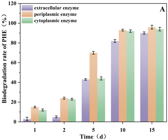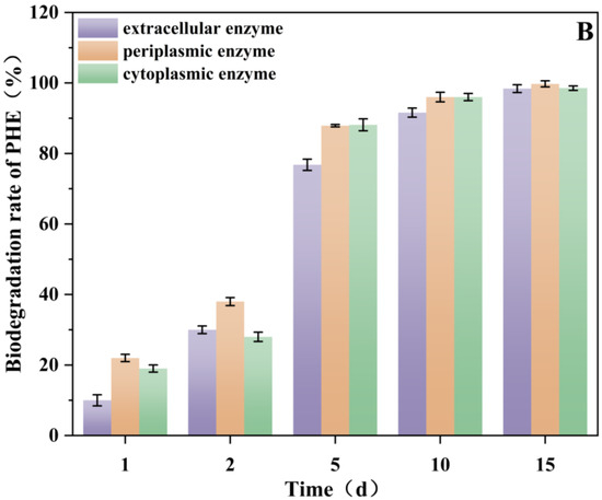 The degradation rate of PHE by cytoplasmic, periplasmic, and extracellular enzymes, (A) PHE degradation by enzyme extracts without rhamnolipids; (B) PHE degradation by enzyme extracts with 20 mg/L rhamnolipids.