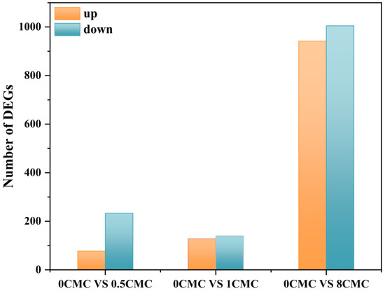 Using transcriptome sequencing, we thoroughly investigated the gene expression profile of Burkholderia sp. FM-2 during phenanthrene degradation in the presence of varying concentrations of rhamnolipids. Transcriptomic comparisons were performed between a control group (0 CMC rhamnolipid) and each of the three rhamnolipid-supplemented groups. As shown in Figure 9, transcriptome analysis revealed pronounced dose-dependent alterations in gene expression. Relative to the control (0 CMC), the addition of 0.5, 1, and 8 CMC rhamnolipids resulted in 300 (77 up-/223 down-regulated), 268 (128 up-/140 down-regulated), and 1947 (942 up-/1005 down-regulated) differentially expressed genes (DEGs), respectively. The sharp increase in DEGs at 8 CMC—nearly seven times that of the 1 CMC group—implies a substantial stress response and possible metabolic disruption under high surfactant load, consistent with studies reporting surfactant-induced cellular stress at concentrations significantly above CMC [45]. Notably, although all tested concentrations were subtoxic based on growth assays, the 8 CMC treatment elicited widespread transcriptional changes indicative of cellular adaptation to stress, including the downregulation of key metabolic and biodegradation genes. In contrast, the 1 CMC treatment induced a more balanced and moderate transcriptomic shift with minimal antagonistic effects on central metabolic pathways. Given that prior degradation experiments confirmed optimal phenanthrene biodegradation at 1 CMC rhamnolipid, and considering the balanced gene expression profile (268 DEGs) without evident toxicity, we focused subsequent mechanistic analysis on the 1 CMC treatment to elucidate the role of rhamnolipids in enhancing phenanthrene degradation.
