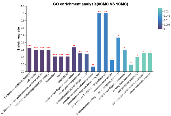 GO classification of DEGs in Burkholderia fungorum FM-2 in the three groups (0 CMC and 1 CMC). Colors indicate the significance of enrichment. By default, the redder the color, the more significantly enriched the GO term is. Specifically, FDR < 0.001 is marked with ***, FDR < 0.01 with **, and FDR < 0.05 with *.