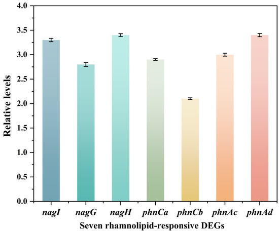 To validate the transcriptomic results, we used quantitative real-time PCR (qRT-PCR) to verify the expression levels of differentially expressed genes responsive to rhamnolipid. Seven genes encoding oxygenases were selected, namely nagI (encoding gentisate 1,2-dioxygenase), nagG and nagH (encoding salicylate 5-hydroxylase), phnCa and phnCb (encoding aromatic ring-opening dioxygenase), and phnAc and phnAd (encoding PAH dioxygenase). The analysis was conducted after 36 h of bacterial cultivation in the presence of 1 CMC rhamnolipid. As illustrated in Figure 11, the relative transcript abundances of these genes showed significant alterations, corroborating the RNA-seq data and highlighting their potential roles in the microbial response to rhamnolipid exposure.