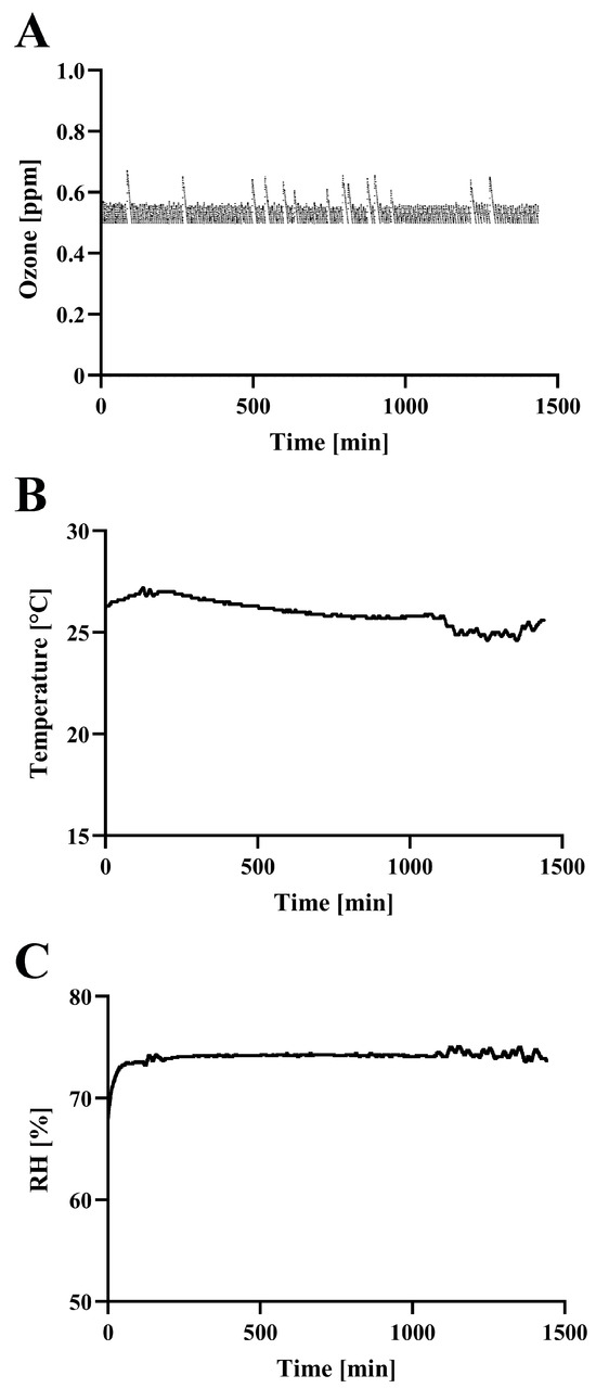 - Nishimura, H.; Sakata, S.; Dapat, I.; Segawa, M.; Mizutani, Y.; Imaizumi, J.; Shirato, K.; Ohmiya, S.; Katsumi, M.; Yokoyama, T. Synergistic Inactivation of Airborne Viruses by Low-Concentration Ozone with High Humidity and Temperature. Microbiol. Immunol. 2025, 69, 280–288. [Google Scholar] [CrossRef]